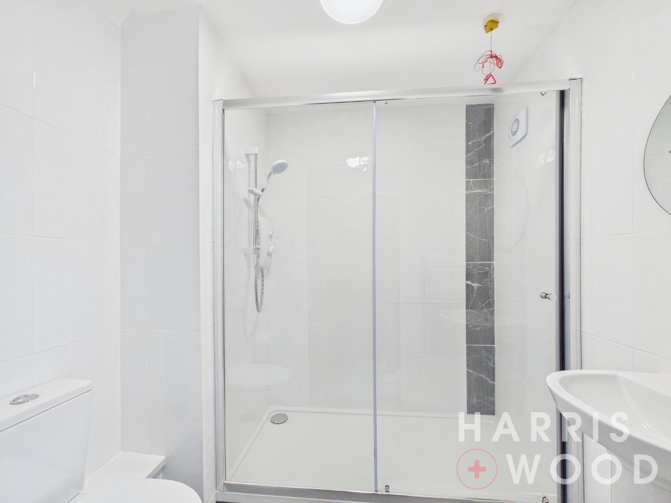 Low level wc, pedestal hand wash basin, shower cubicle, fully tiled walls, extractor fan, heated towel rail