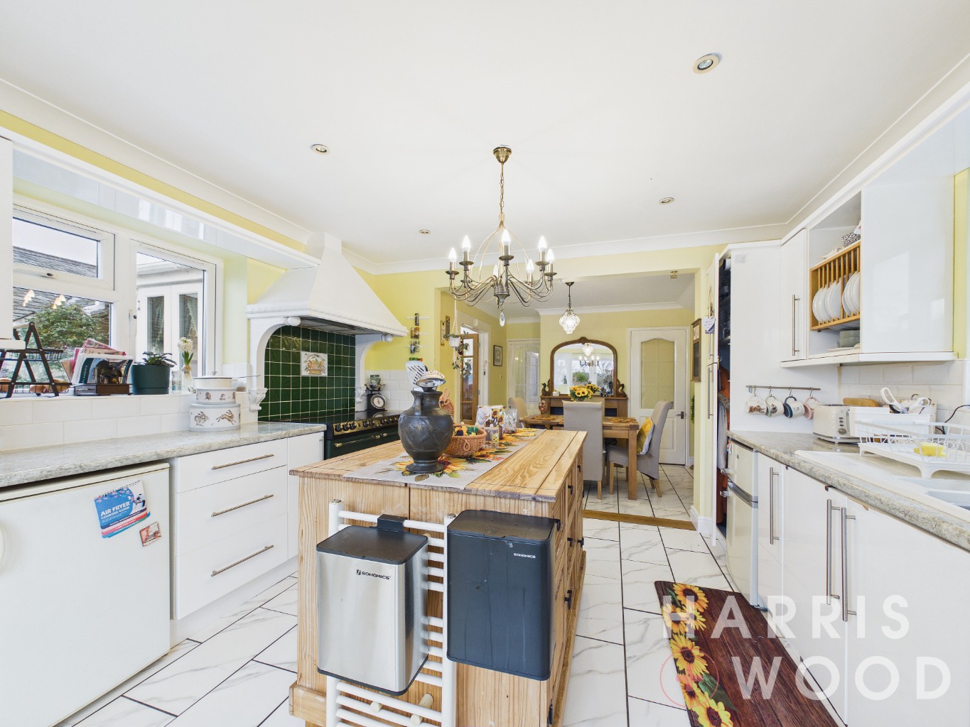Double glazed windows, French doors to rear leading out onto the rear garden, wall and base level units, sink and drainer with mixer tap over, oven and hob, extractor fan, worktops, space for appliances