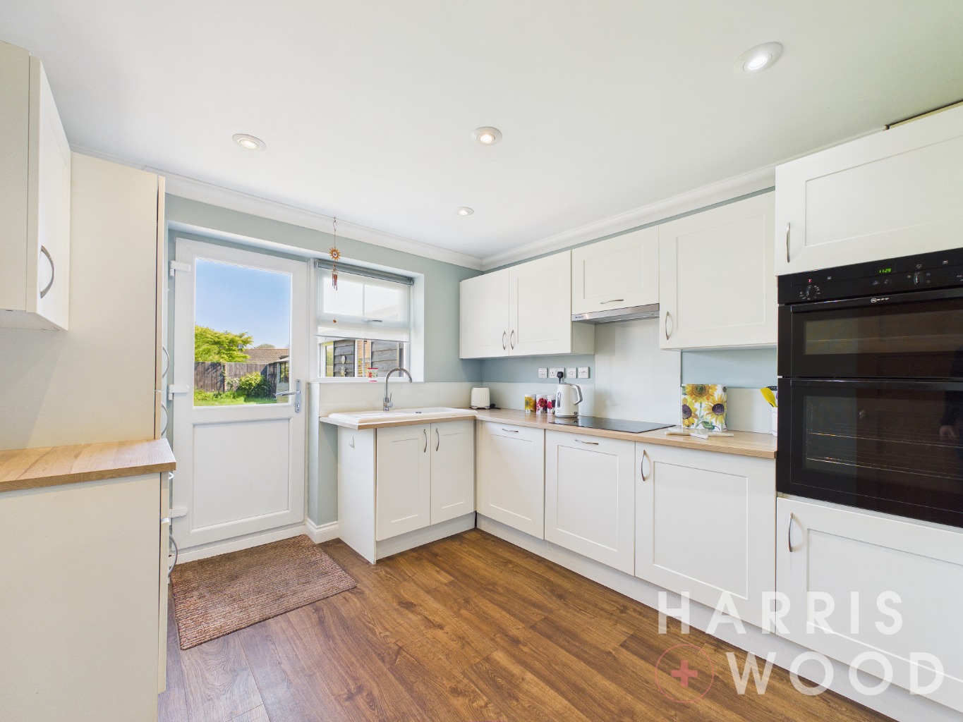 Double glazed window and door, wall and base level units, sink and drainer with mixer tap over, oven and hob, extractor fan, worktops, space for appliances