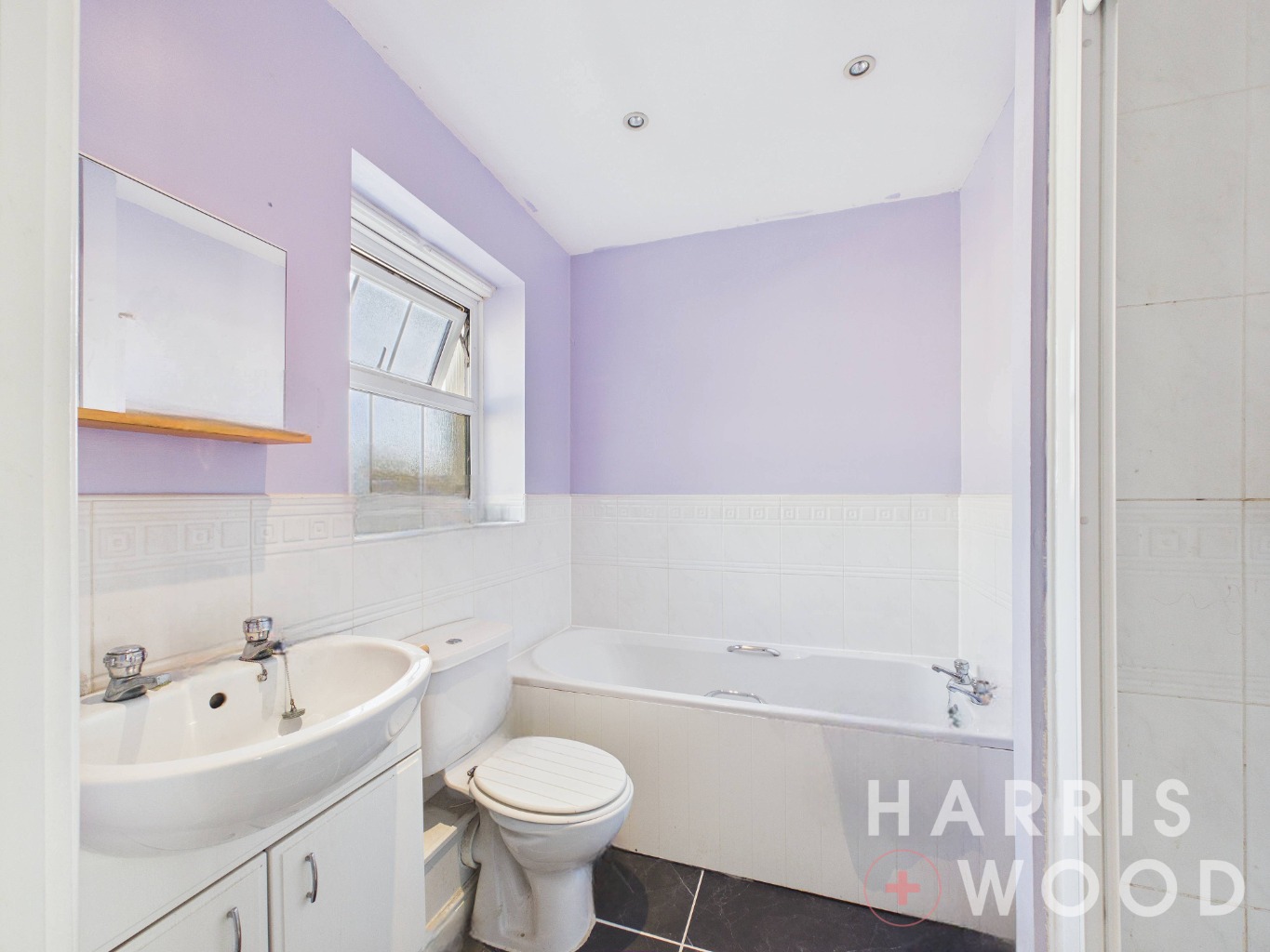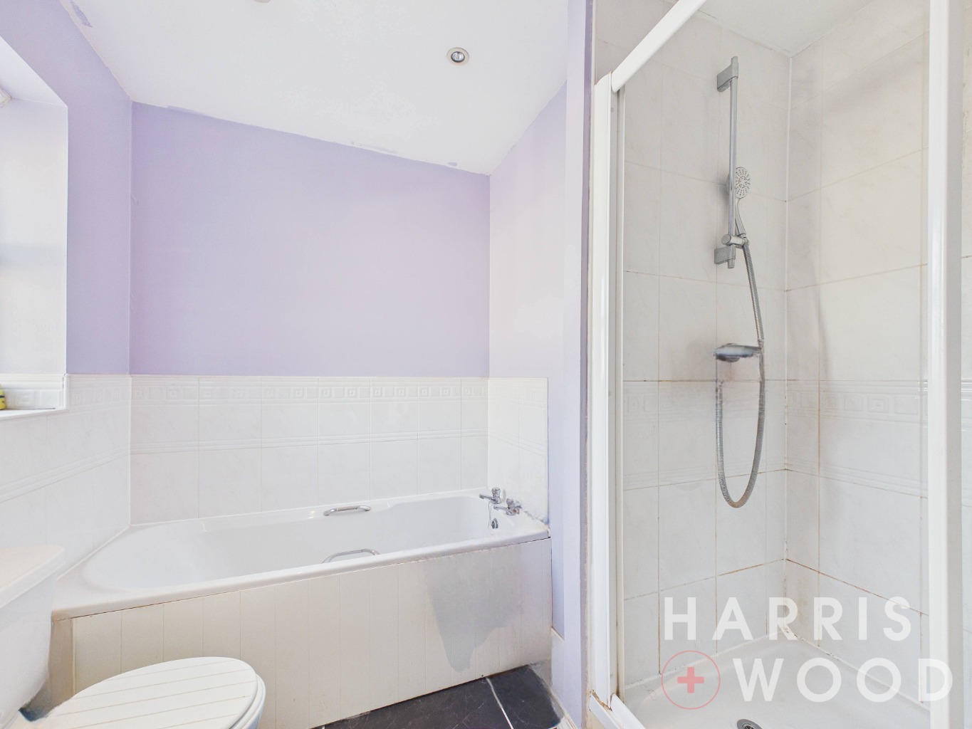 Double glazed window, low level WC, wash hand basin, panelled bath, shower cubicle, partly tiled walls