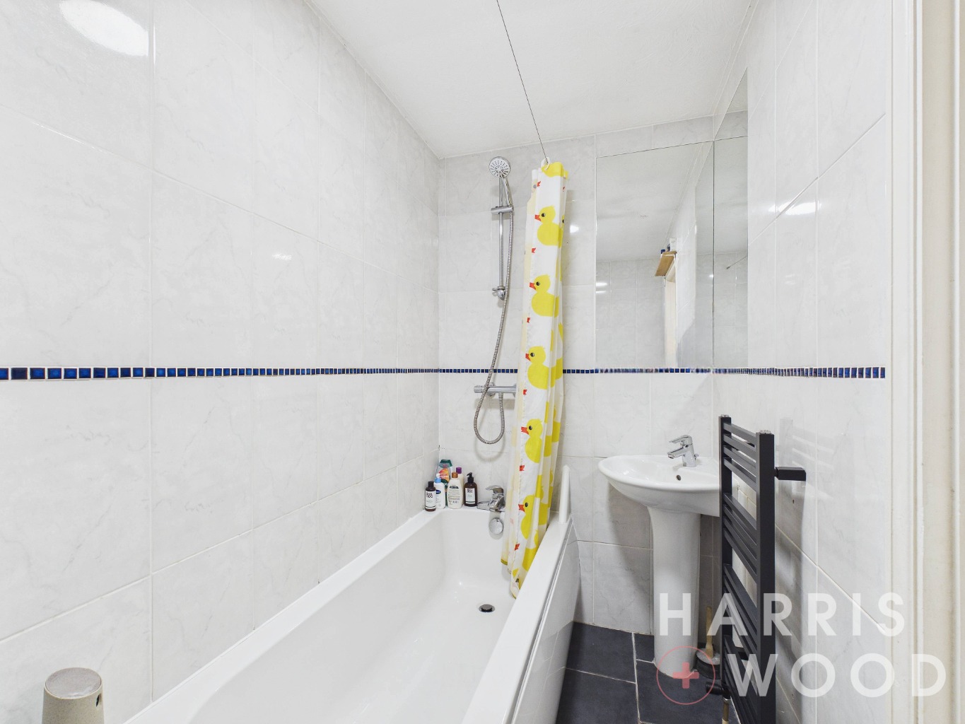 Heated towel rail, low level wc, pedestal hand wash basin, extractor fan, panelled bath with shower over, fully tiled walls, tiled floor