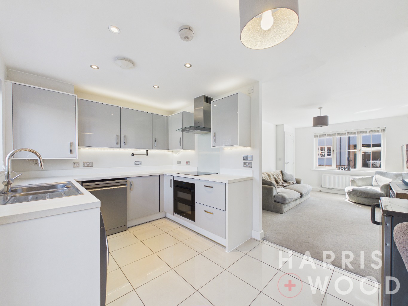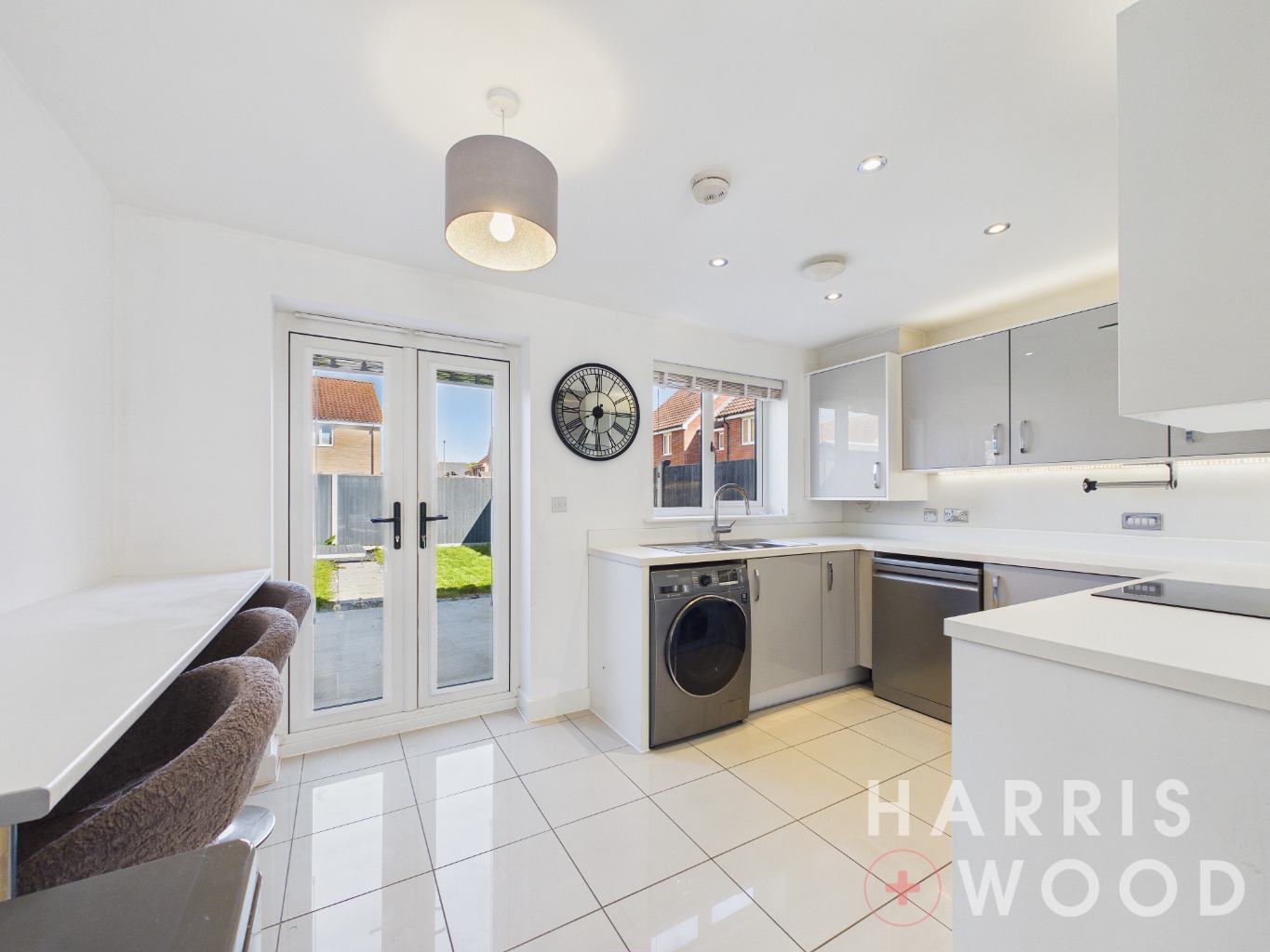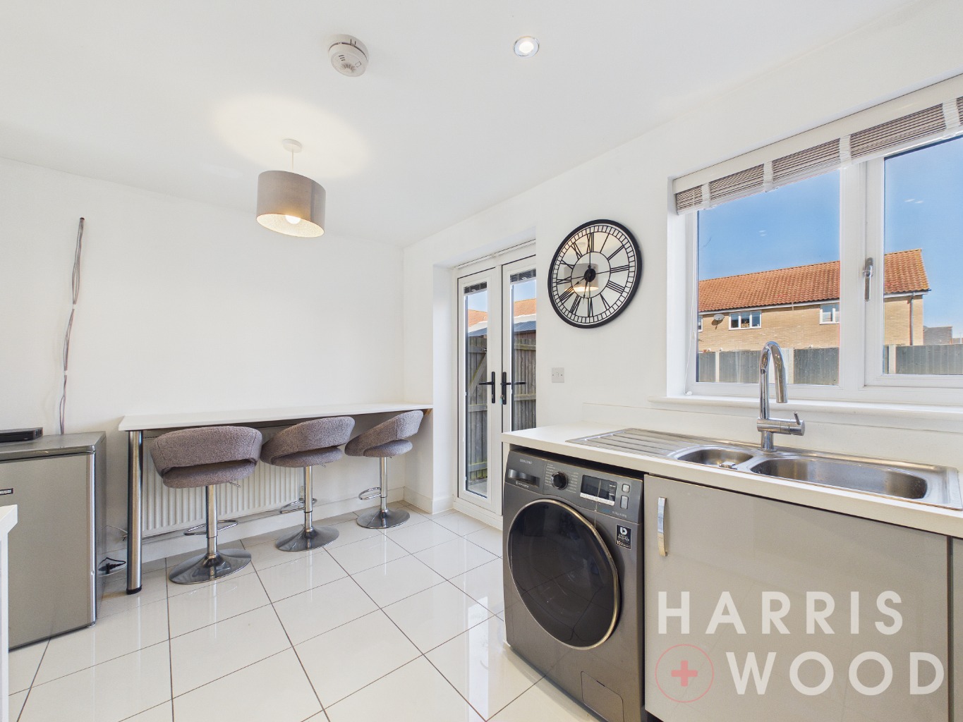 Double glazed window and double doors leading out onto rear garden, wall and base level units, breakfast bar with inset sink and drainer with mixer tap over, oven and hob, extractor fan, worktops, integrated appliances, tiled flooring, radiator
