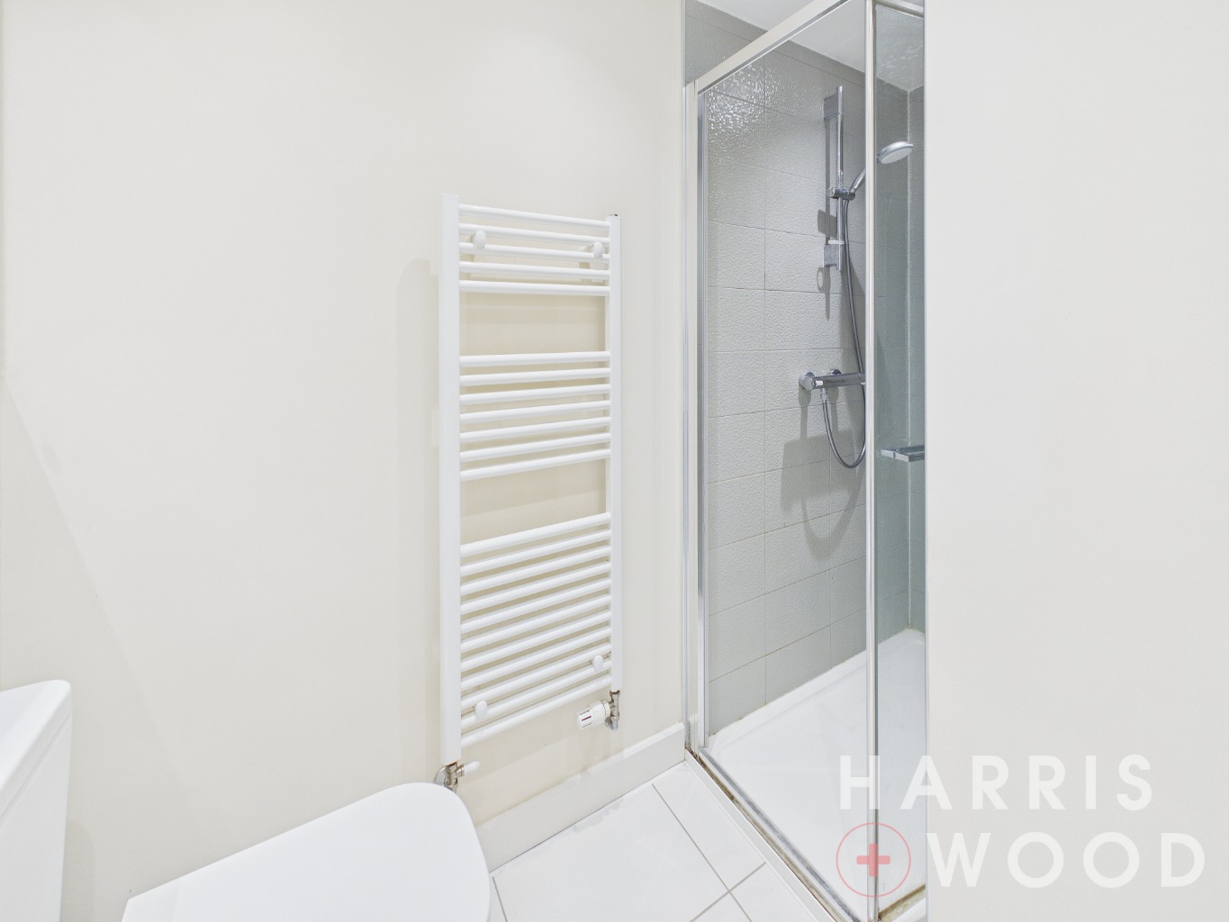 White suite comprising pedestal wash hand basin, low level WC, recessed shower cubicle, radiator, tiled flooring