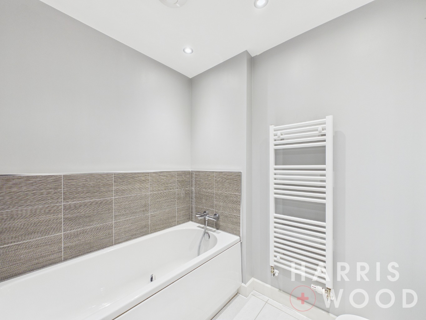 White suite comprising panelled bath with mixer tap and shower attachment, pedestal wash hand basin, low level WC, radiator, tiled flooring