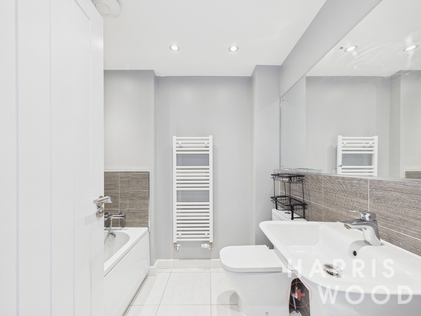 White suite comprising wash hand basin, low level WC, radiator, tiled flooring