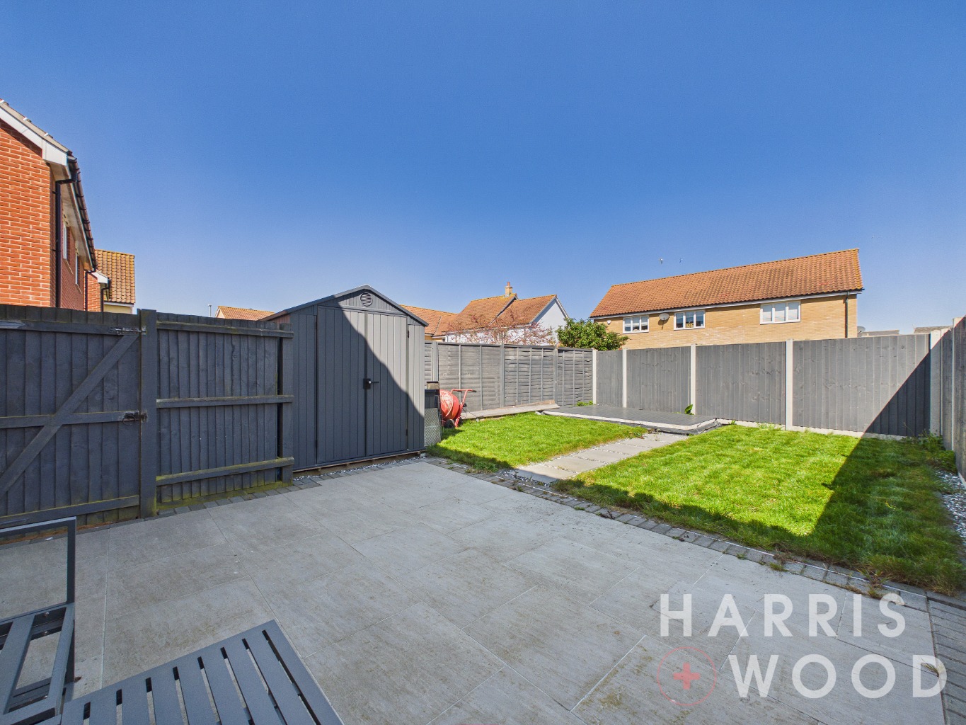Fully enclosed and private, substantial porcelain tiled patio area adjacent to the rear of the house leading to lawned areas and access to timber shed