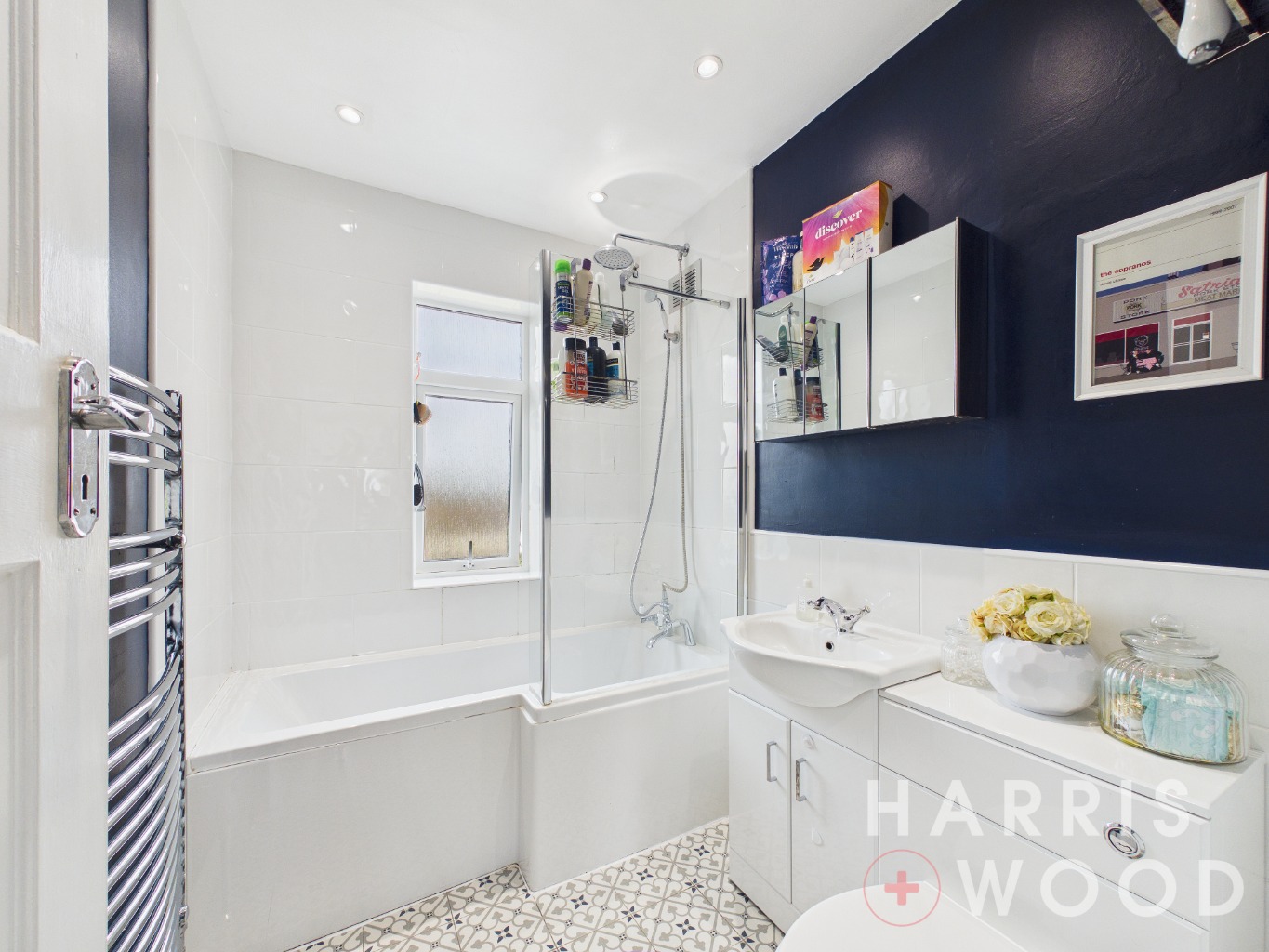 Double glazed window to rear, panelled bath with glass shower screen and shower over, chrome heated towel rail radiator, close coupled WC, wash hand basin with mixer tap over
