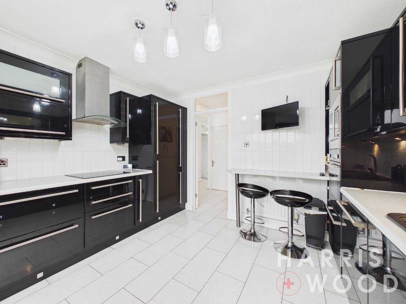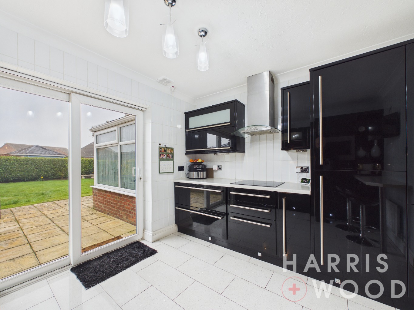 Sliding doors leading out onto the rear garden, wall and base level units, sink and drainer with mixer tap over, oven and hob, extractor fan, integrated appliances, tiled splashbacks, tiled flooring