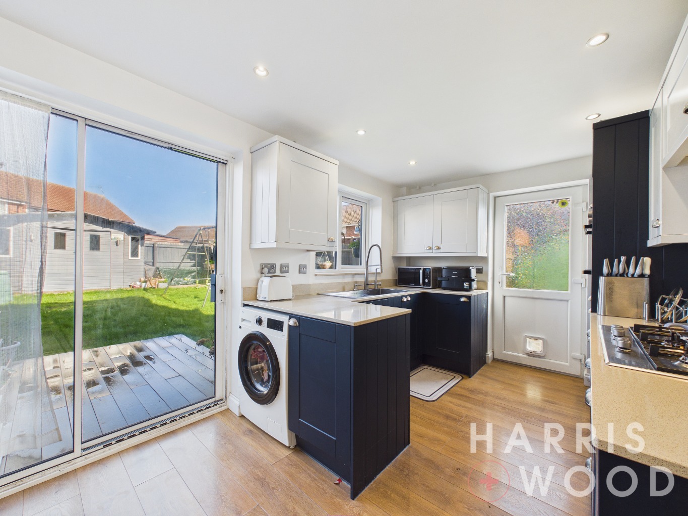 Double glazed window and sliding doors, wall and base level units, sink and drainer with mixer tap over, oven and hob, extractor fan, worktops, integrated appliances, radiator