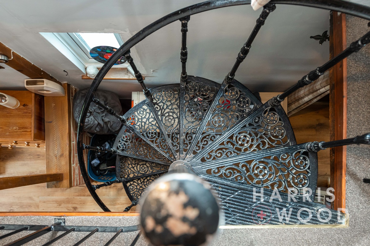 Spiral staircase rising to the first floor landing, radiator, opening to: