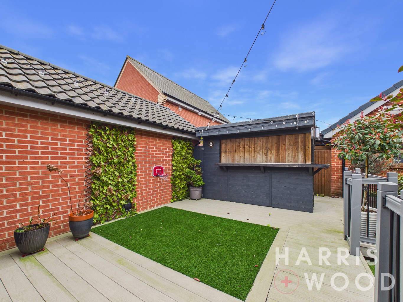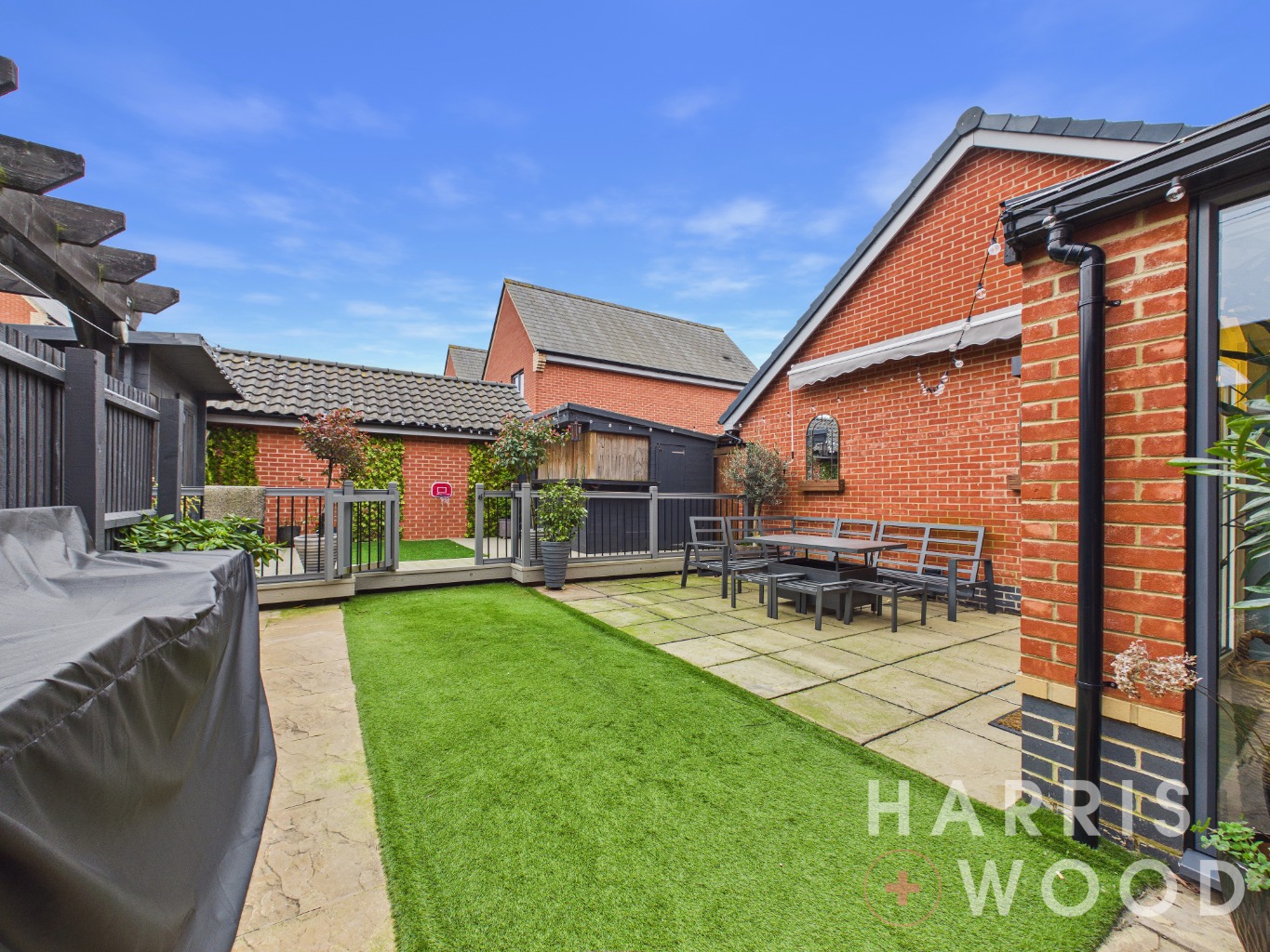 Rear Garden - Sectioned with patio, artificial lawn, decked areas and outbuildings to remain