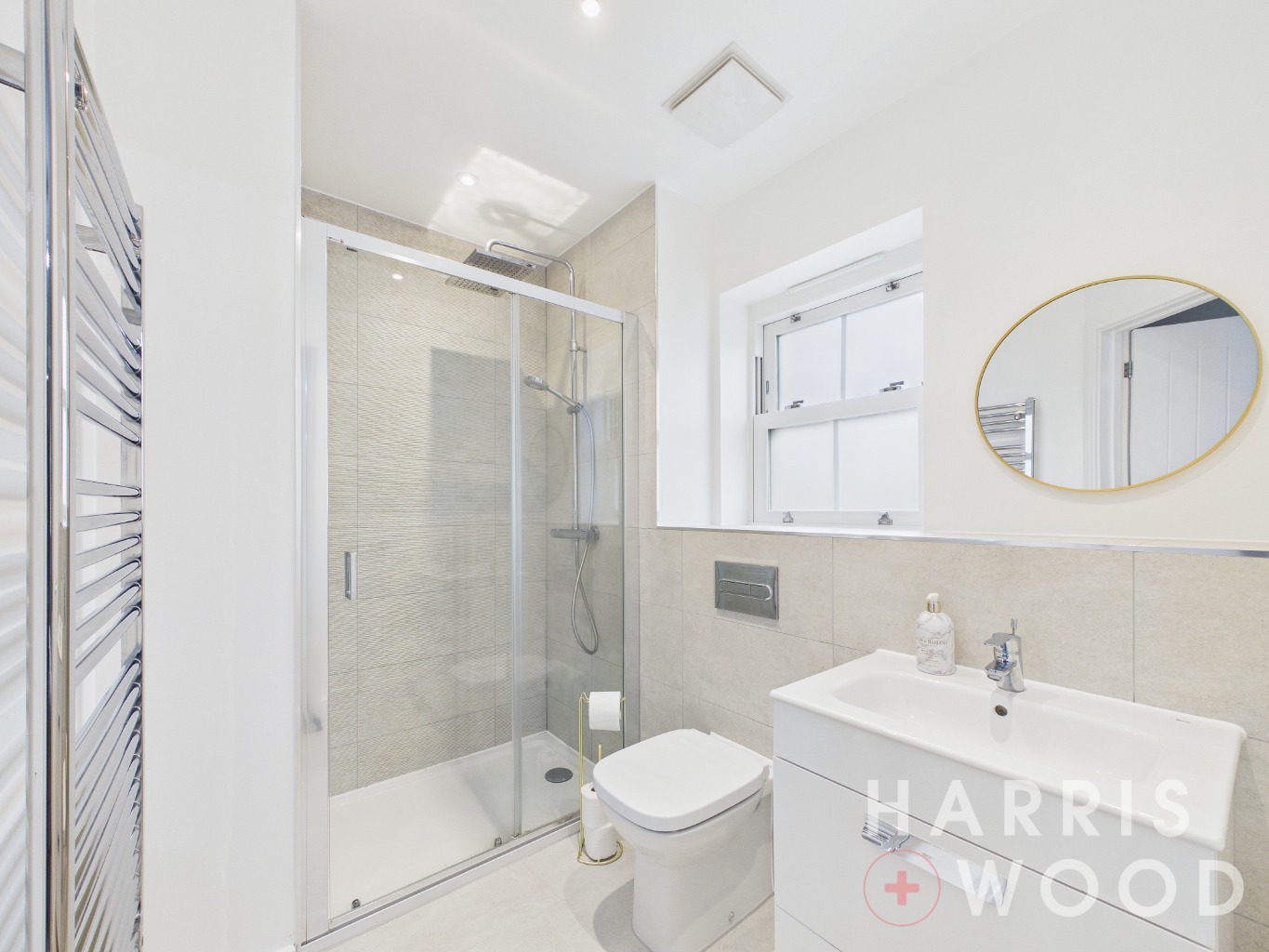 Double glazed window, low level WC, wash hand basin, shower cubicle, heated towel rail, partly tiled