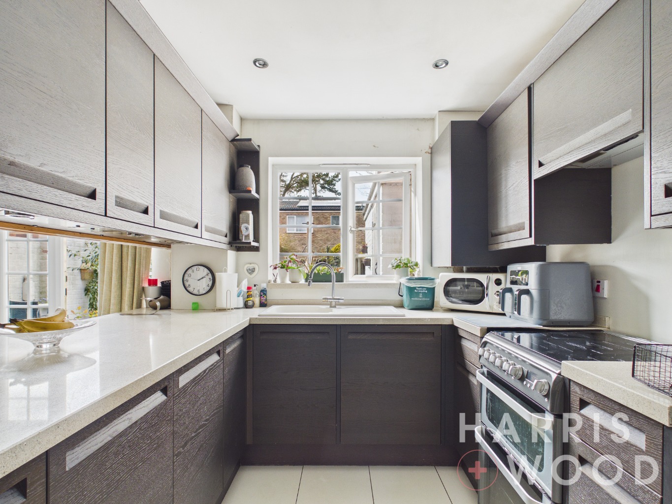 Double glazed window to rear, modern fitted kitchen comprising matching wall and base level units with work surfaces over, inset sink with tap over, integral appliances
