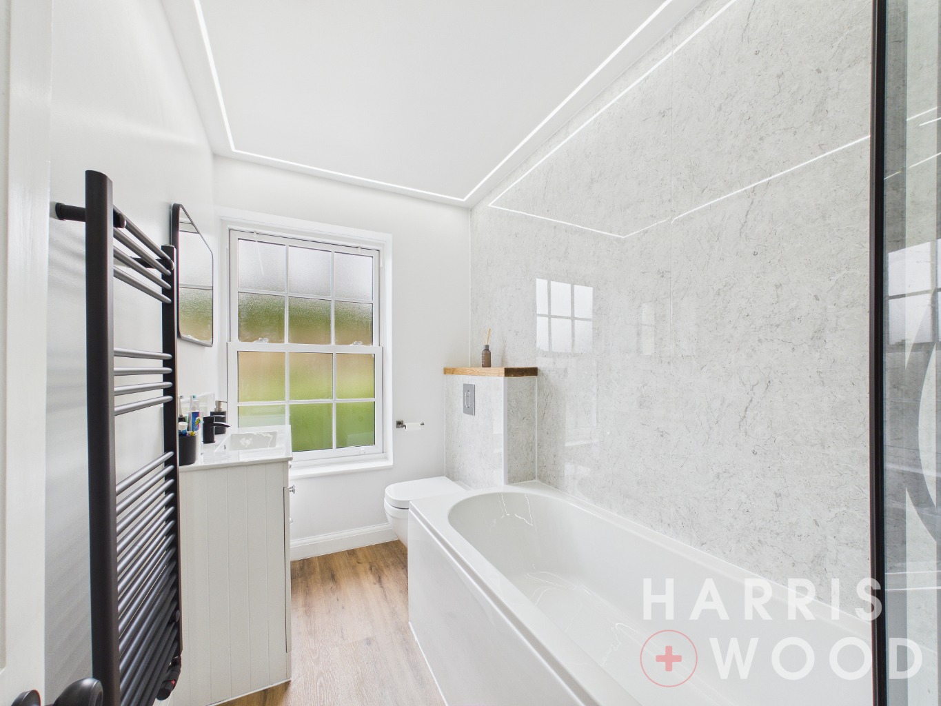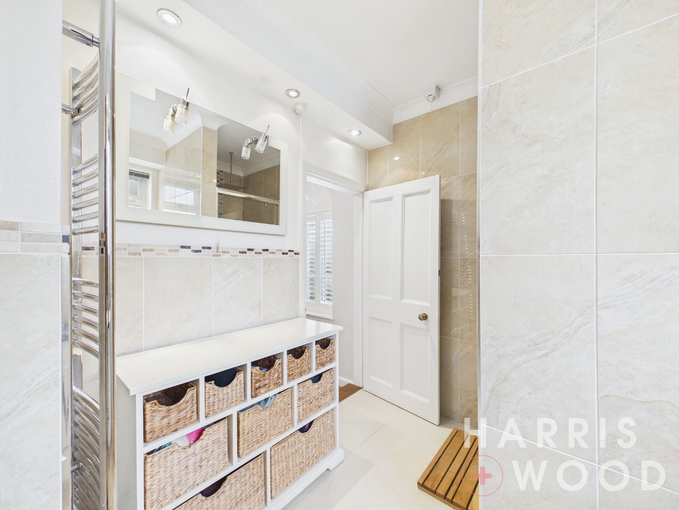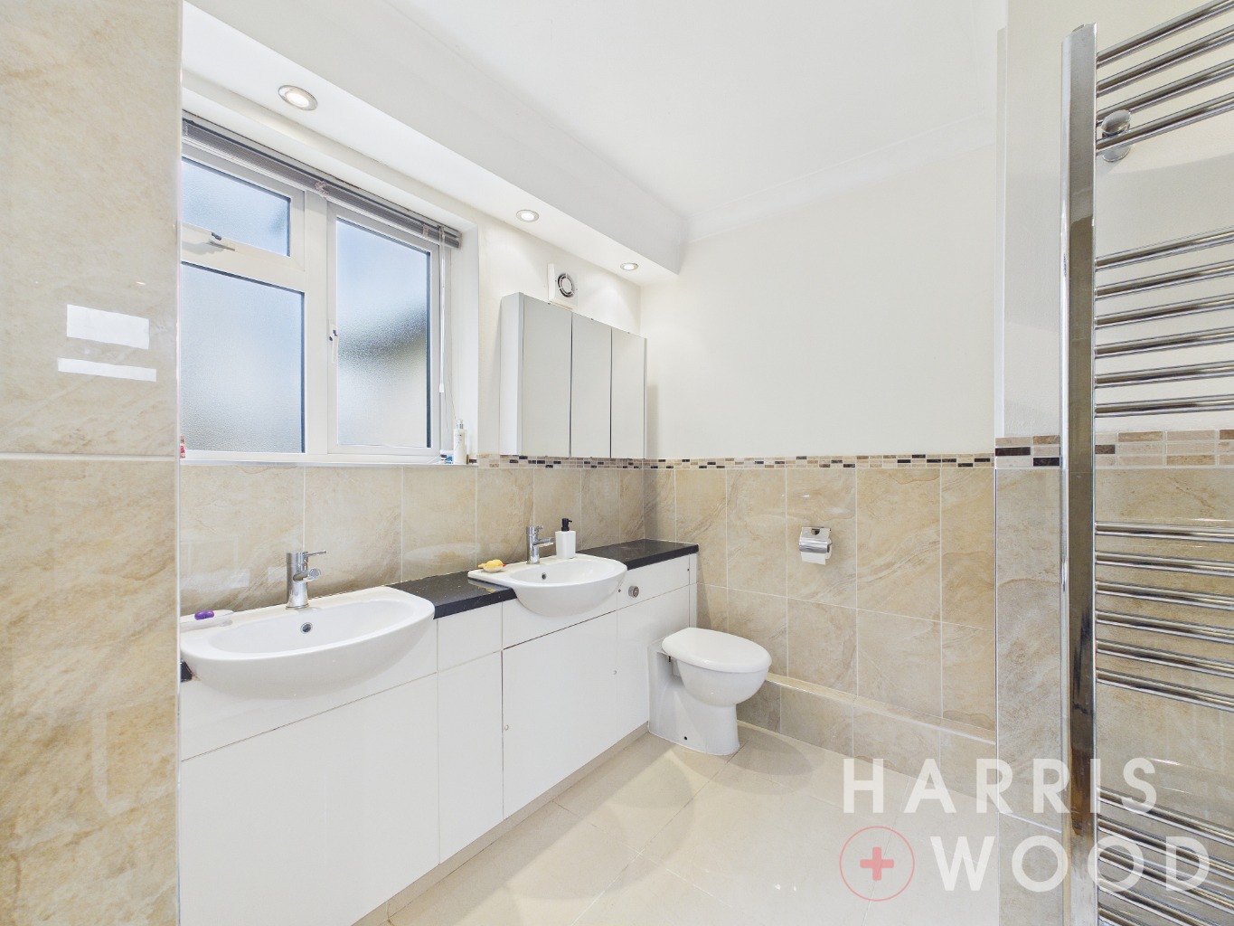 Double glazed window, low level WC, his and her wash hand basins, shower cubicle, heated towel rail