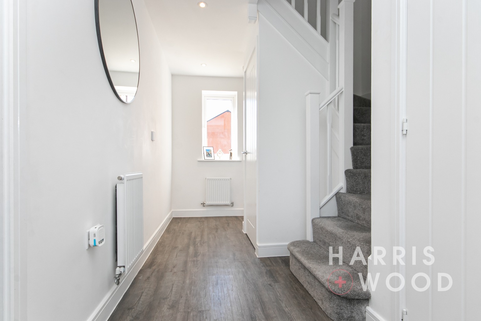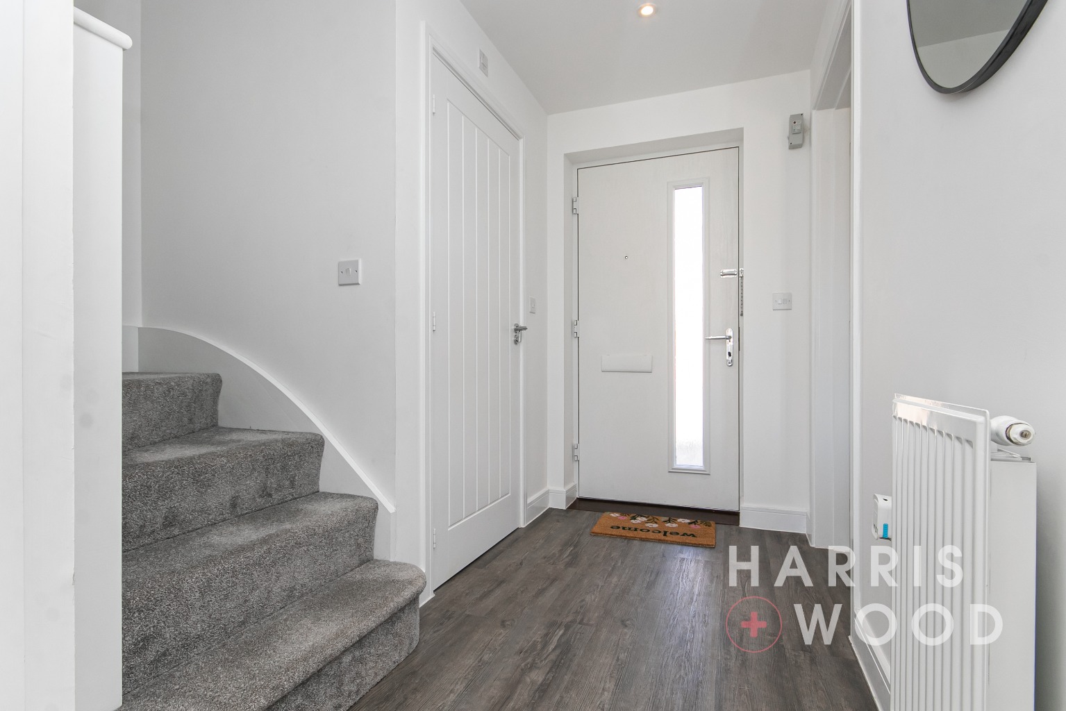 Entrance door, stairs rising to the first floor landing, doors leading off