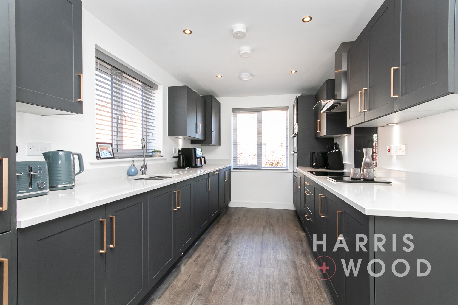 Double glazed window, wall and base level units, sink and drainer with mixer tap over, oven and hob, extractor fan, worktops, integrated appliances