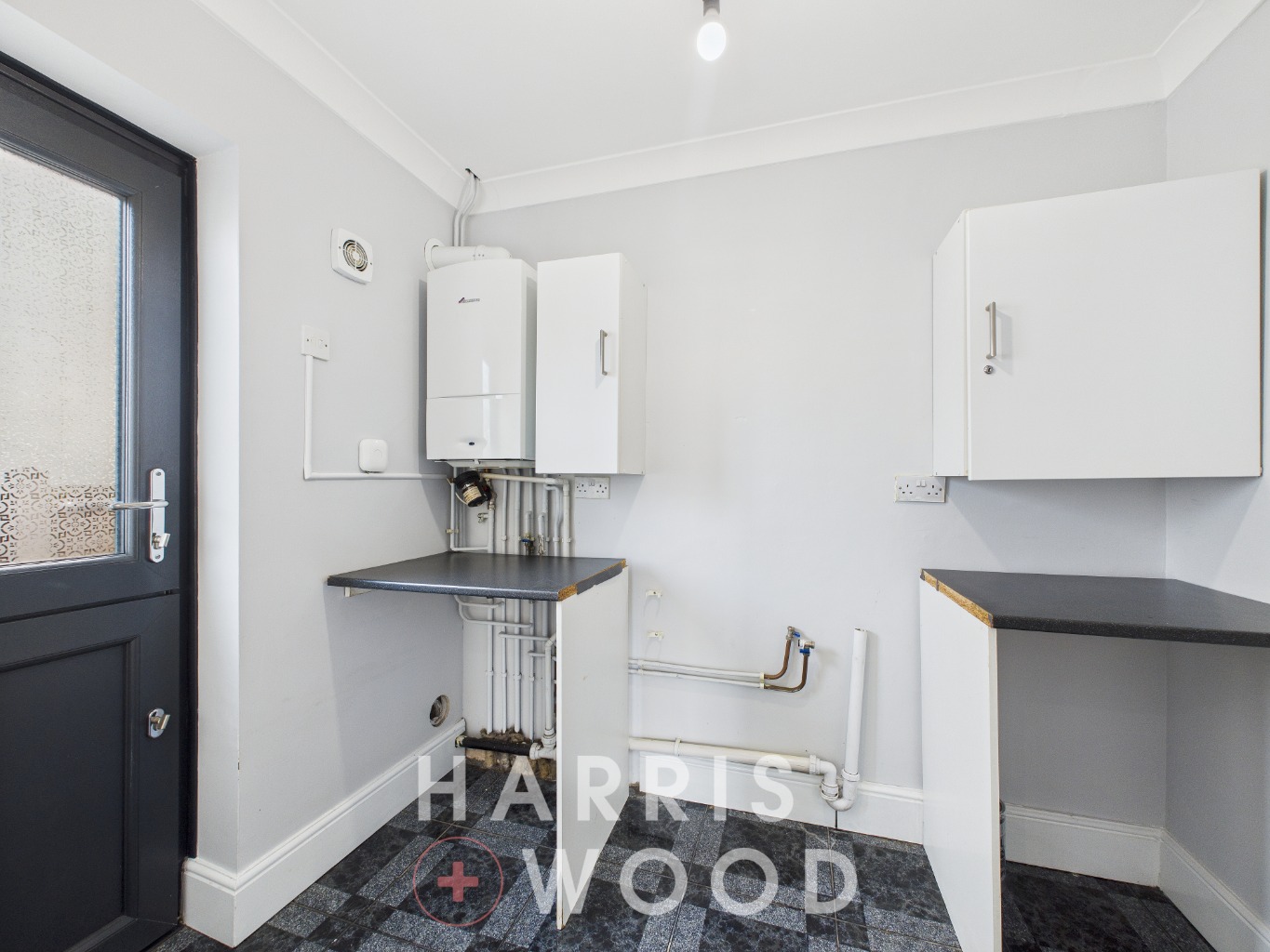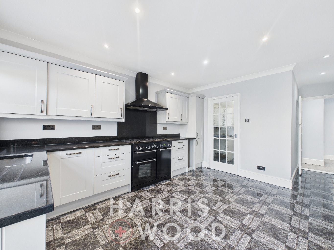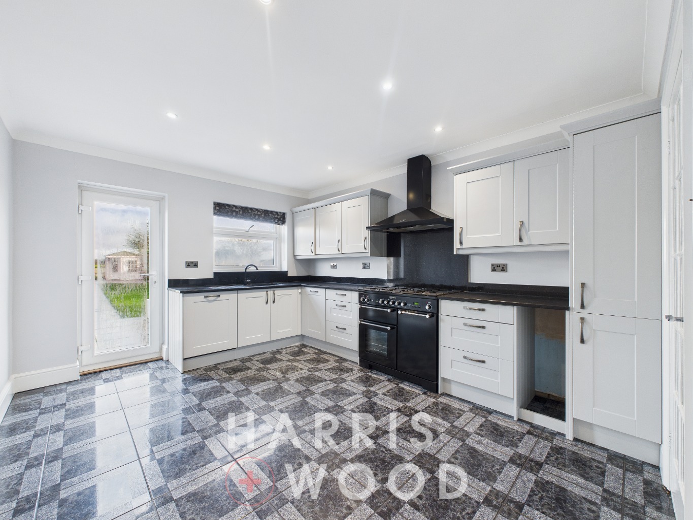 Double glazed window and door, wall and base level units, sink and drainer with mixer tap over, oven and hob, extractor fan, worktops, space for appliances
