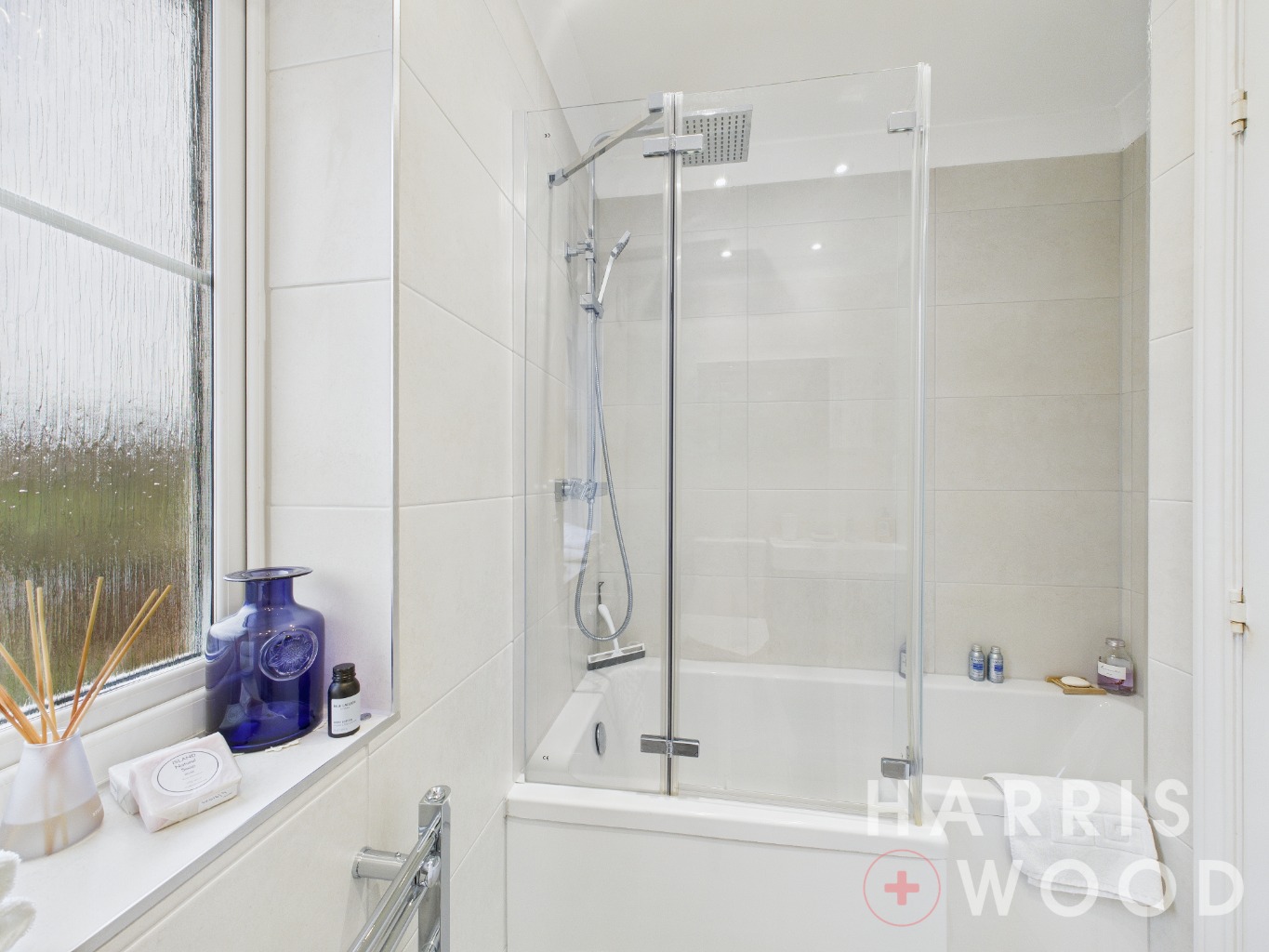 Double glazed window to front, close coupled WC, wash hand basin, P shaped bath with shower over and screen, chrome heated towel rail