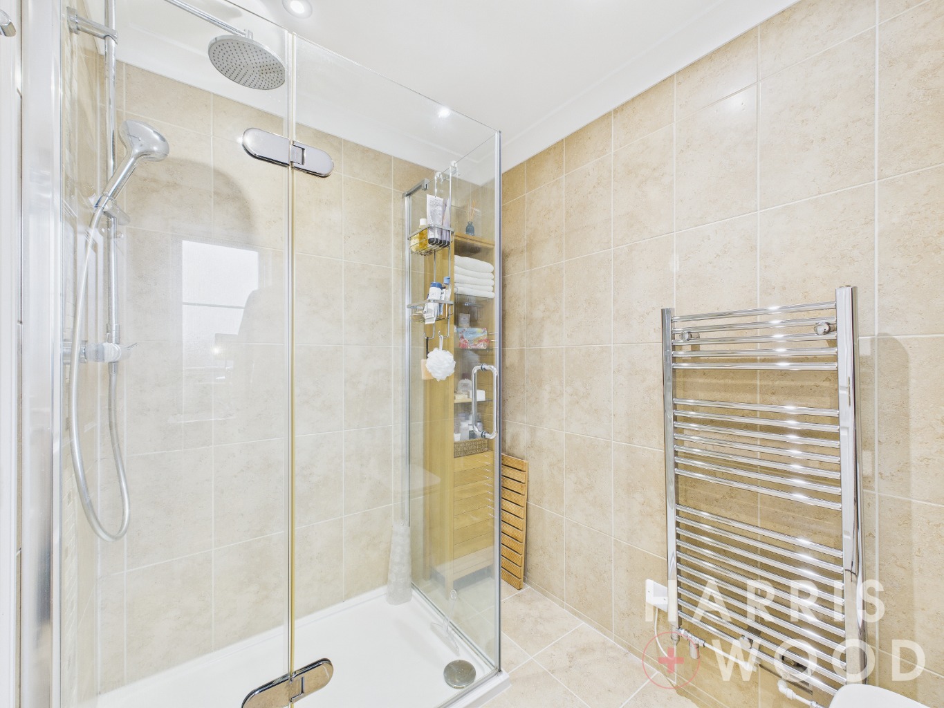 Double glazed window to side, close coupled WC, wash hand basin, shower cubicle, chrome heated towel rail, fully tiled