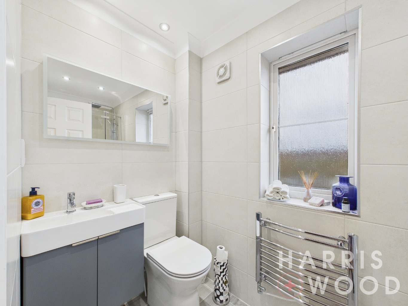 Close coupled WC, wash hand basin, chrome heated towel rail