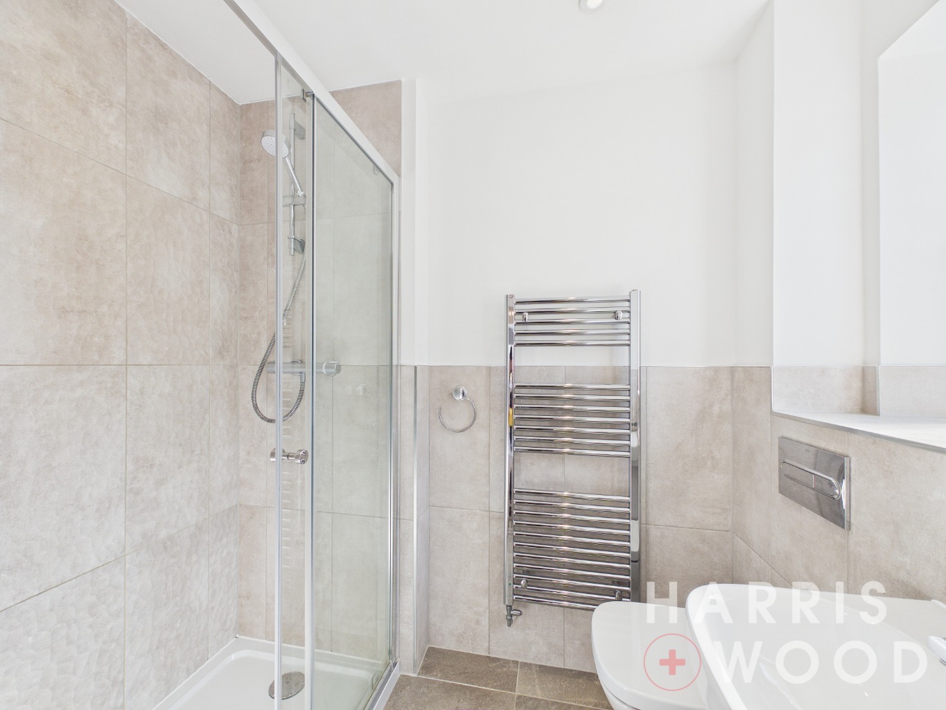 Double glazed window, low level WC, wash hand basin, fully tiled shower cubicle, chrome heated towel rail