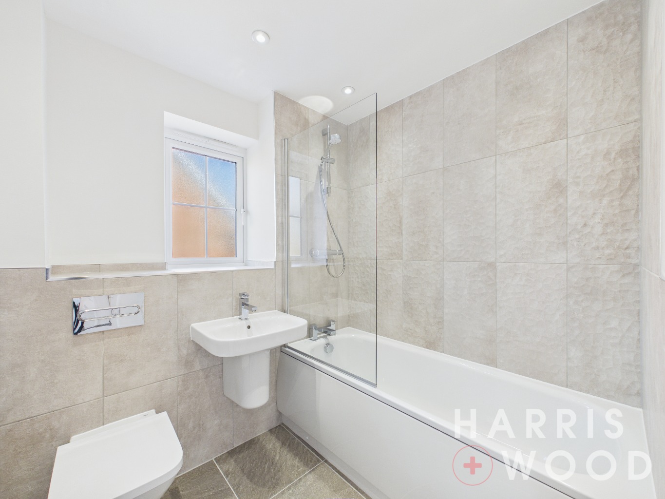 Double glazed window, low level WC, wash hand basin, bath with shower over, chrome heated towel rail