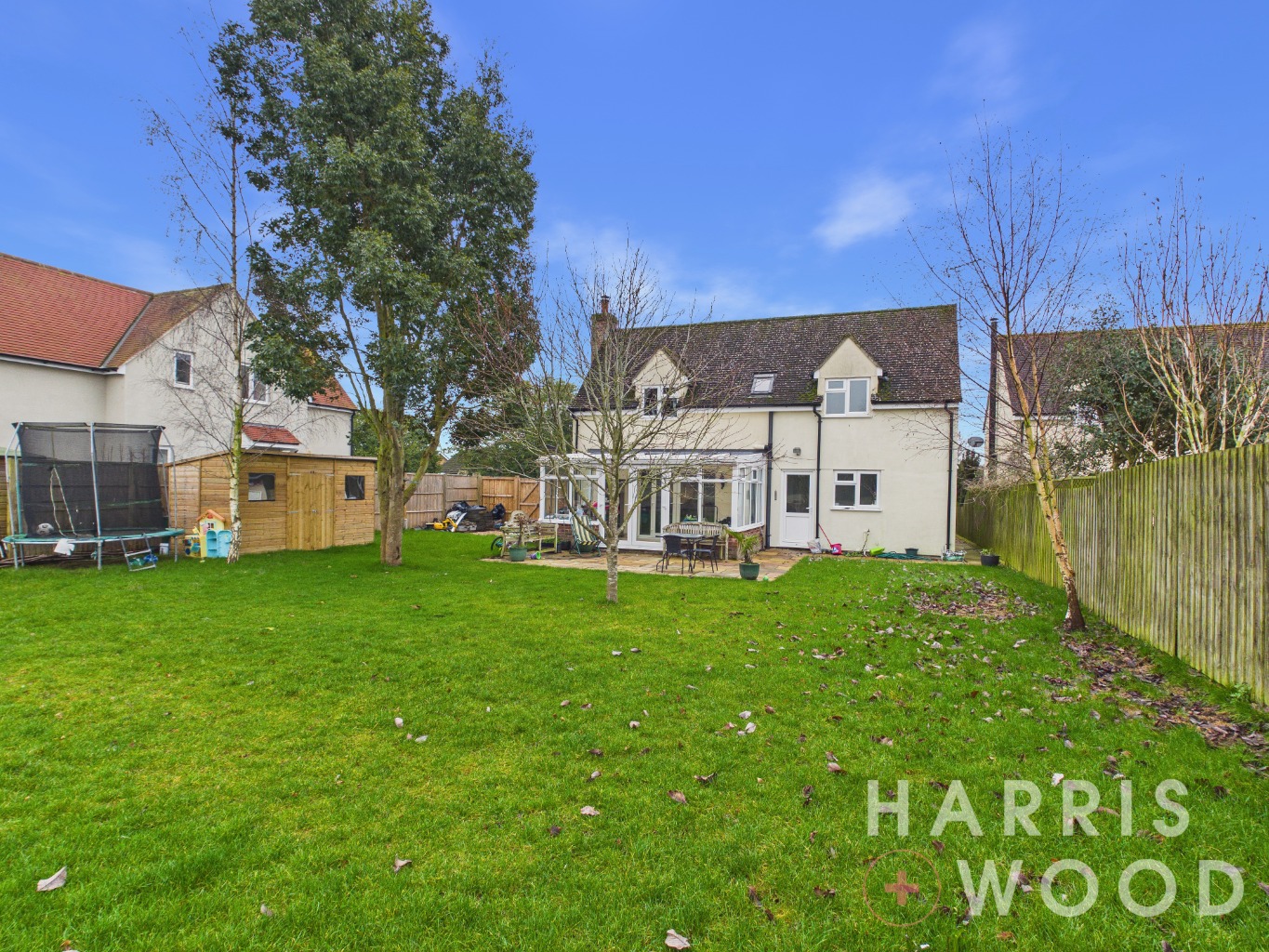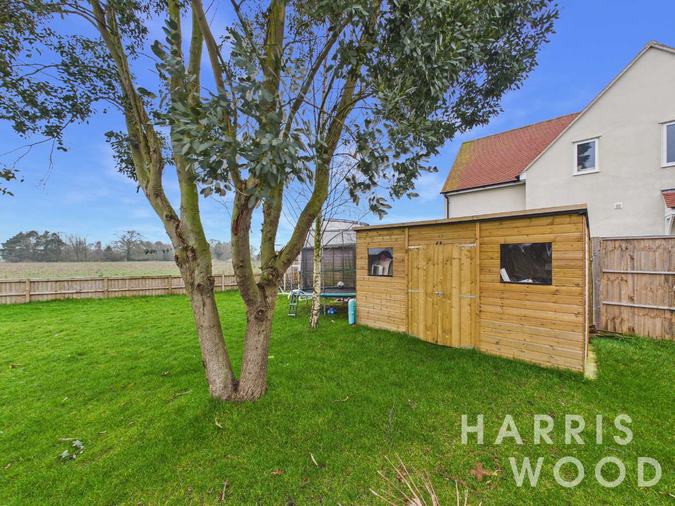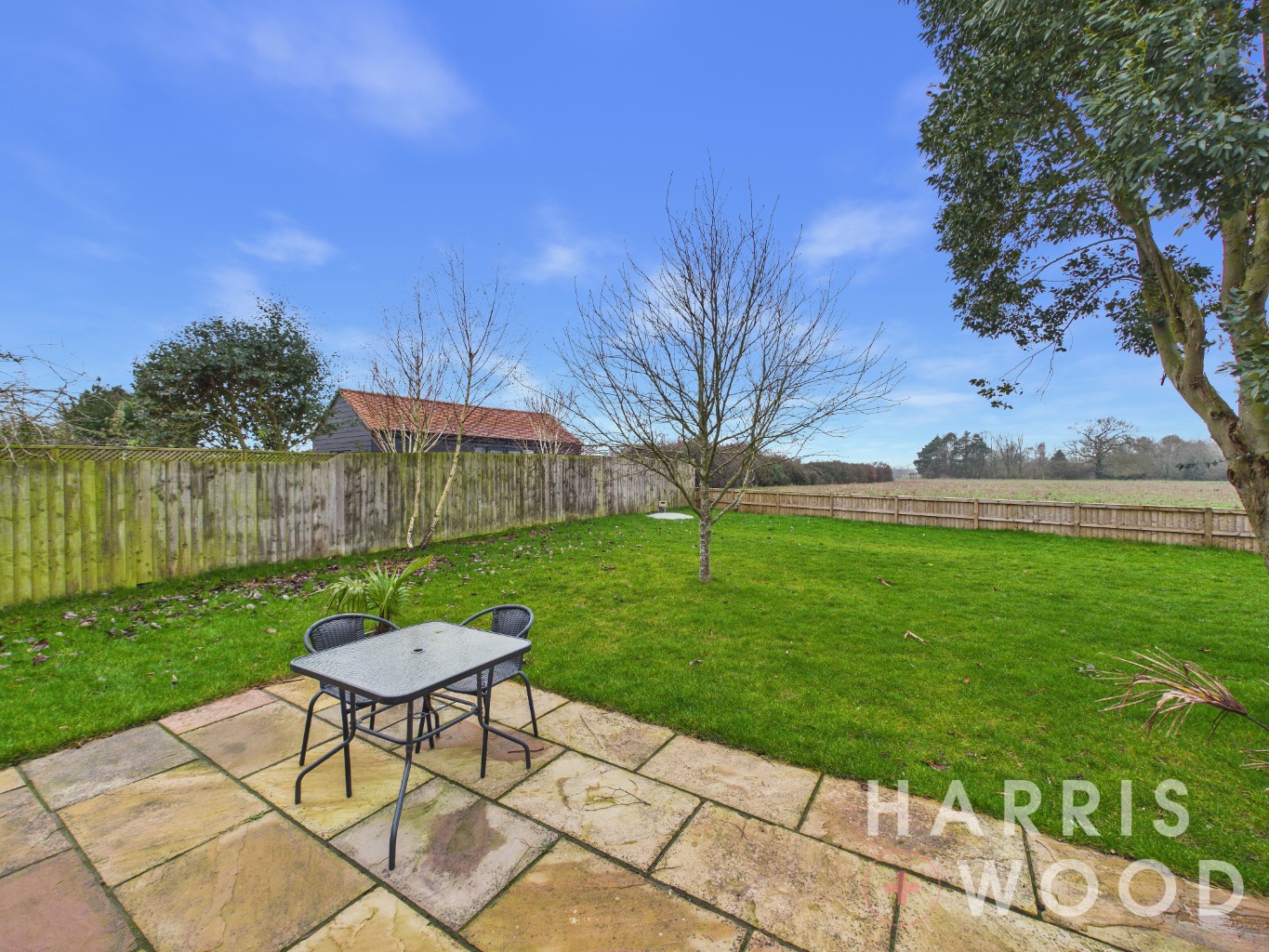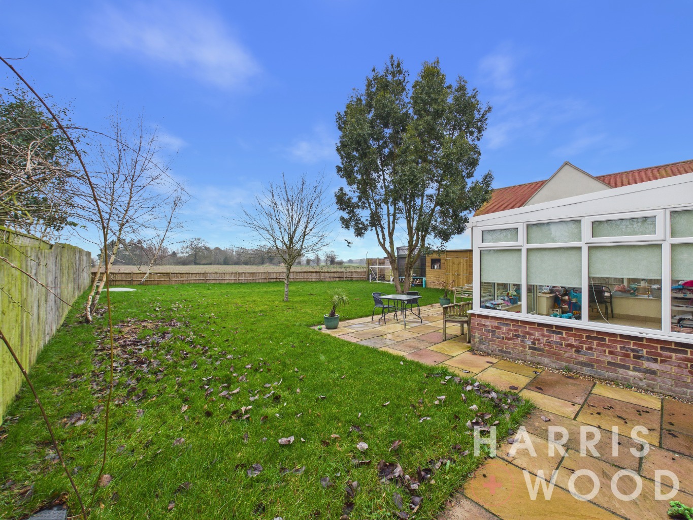 Fully enclosed and private, views over fields, mainly laid to lawn, patio seating area, trees, shed