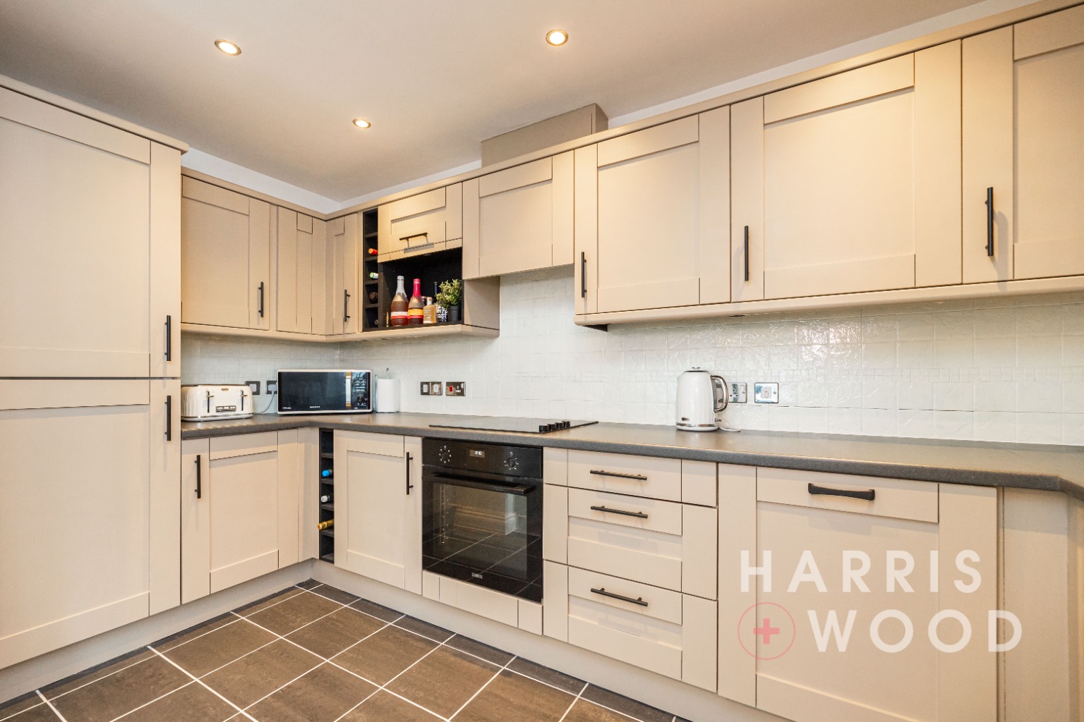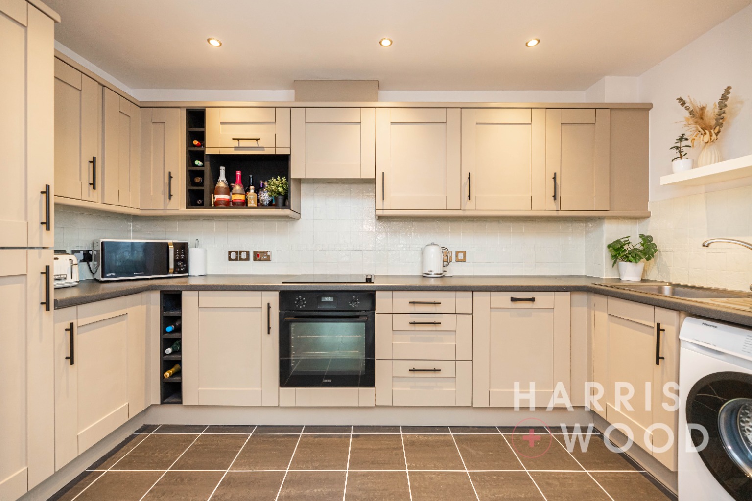 Wall and base level units, sink and drainer with mixer tap over, oven and hob, extractor fan, worktops, space for appliances