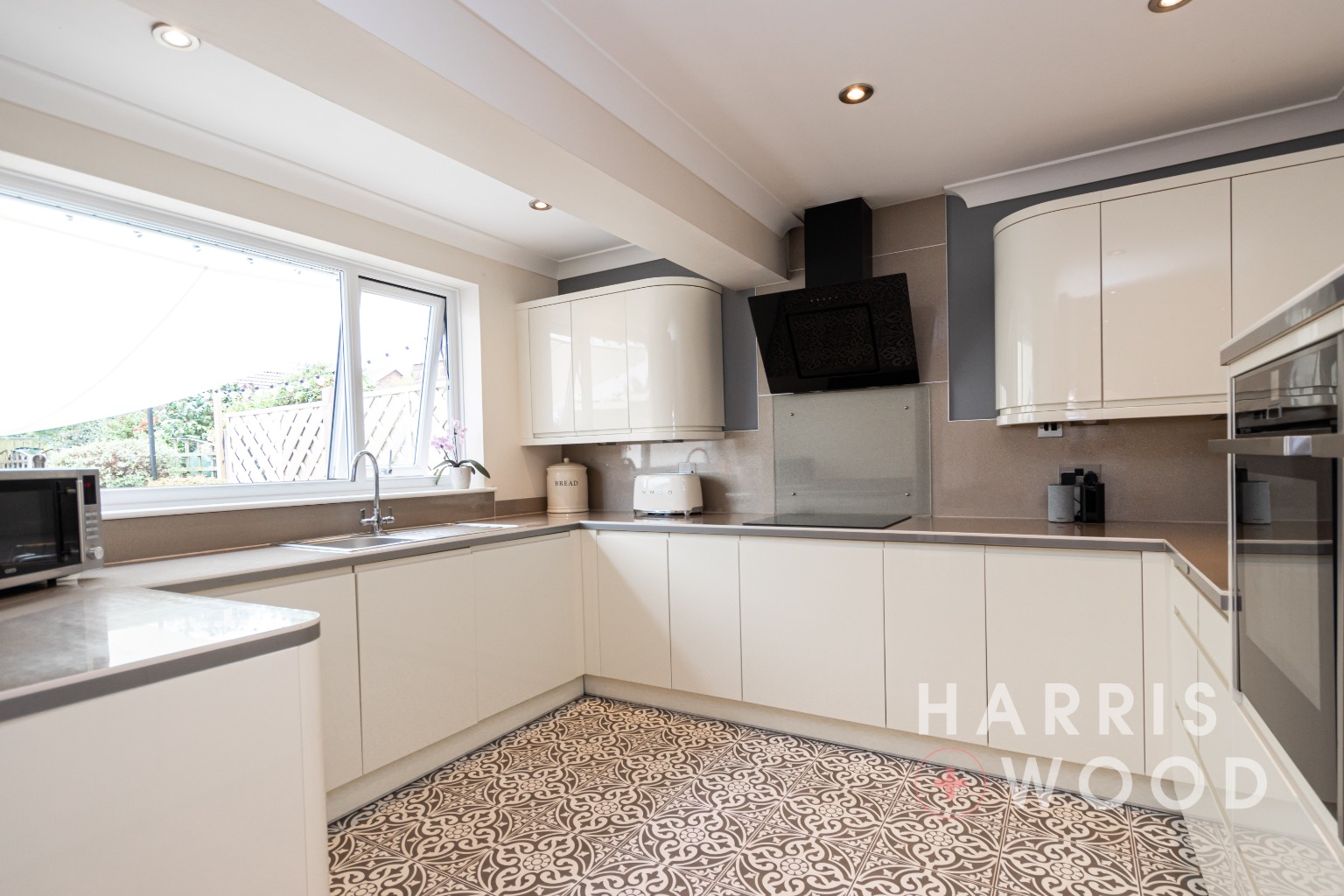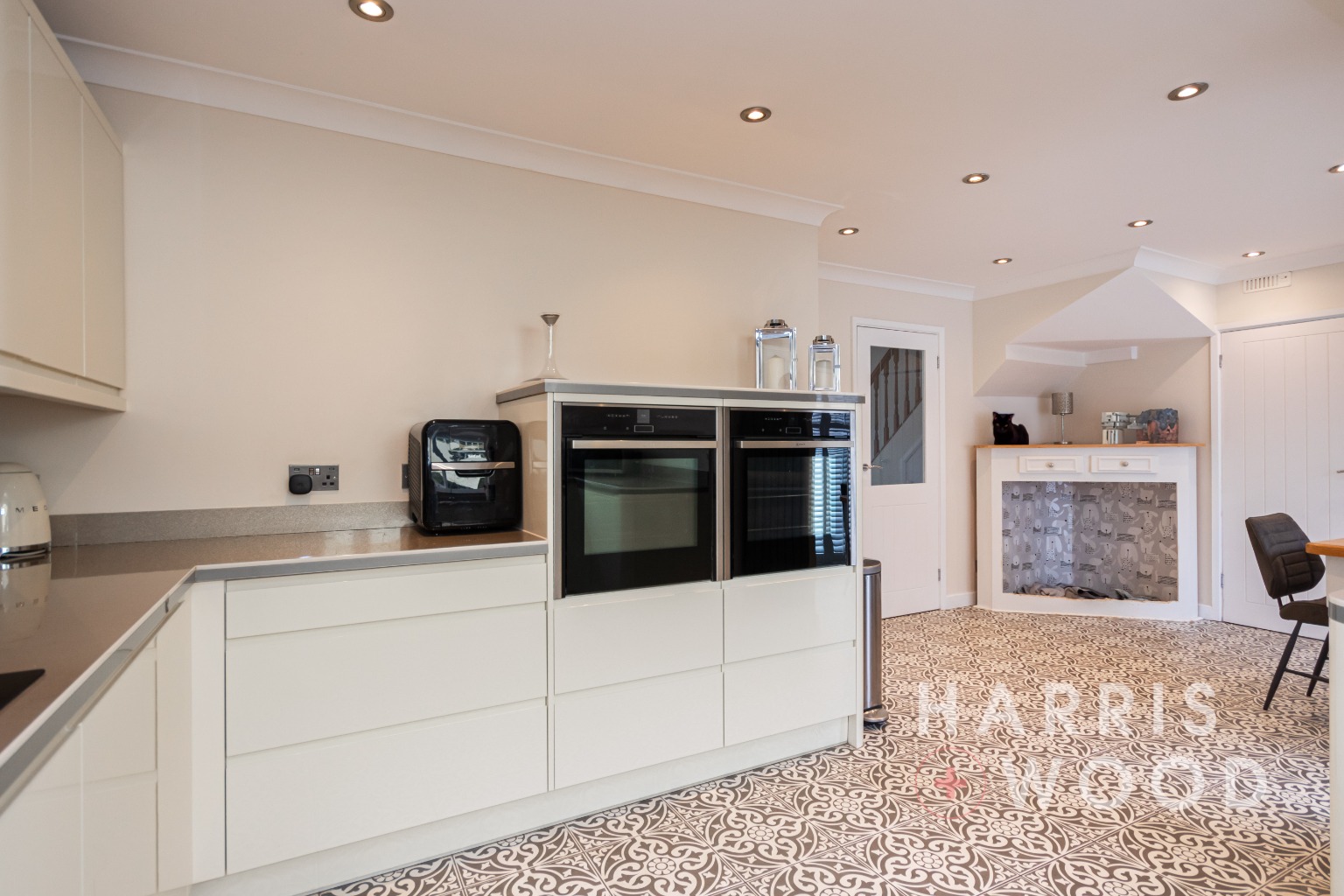 Double glazed window and French doors to rear leading out onto the rear garden, modern wall and base level units, sink and drainer with mixer tap over, oven and hob, extractor fan, worktops, integrated appliances, space for dining table and chairs