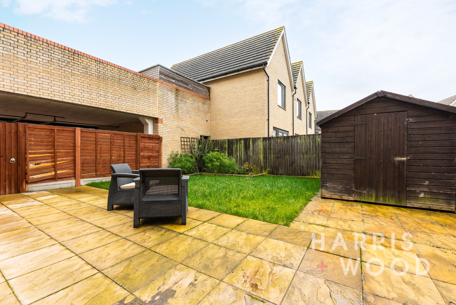 Fully enclosed and private, south facing, patio area, landscaped, lawn, shed