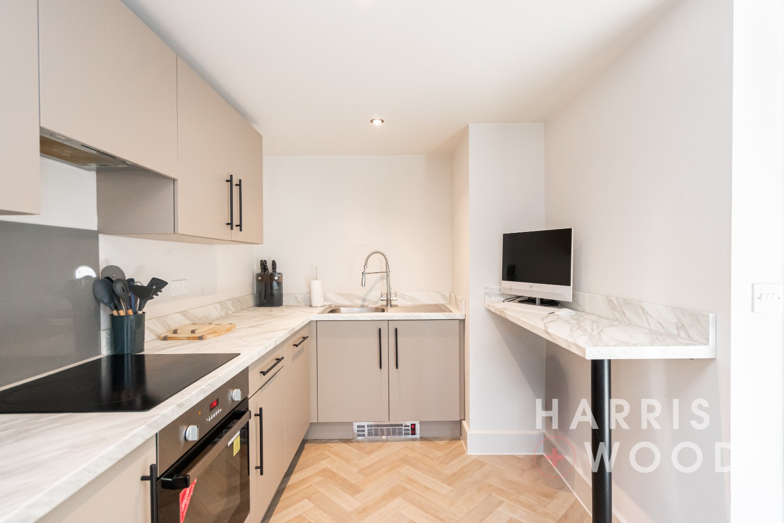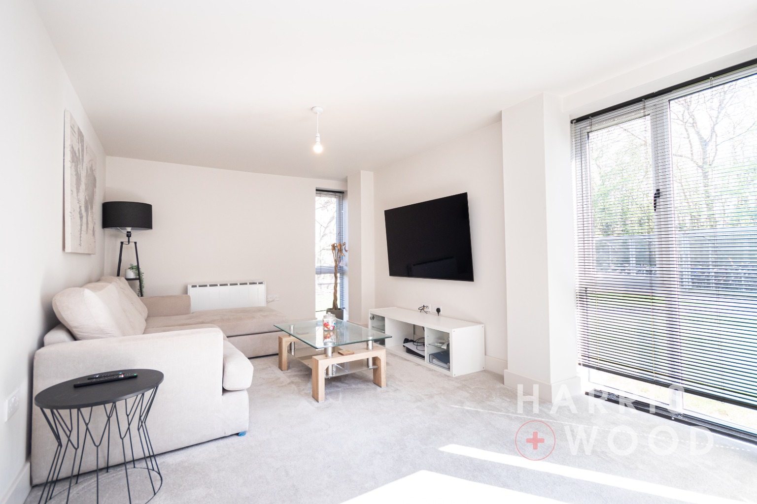 The accommodation comprises a spacious open-plan living/dining area, a contemporary fitted kitchen, two well-proportioned bedrooms, and a sleek family bathroom. Large windows allow for plenty of natural light, enhancing the airy and welcoming atmosphere throughout.