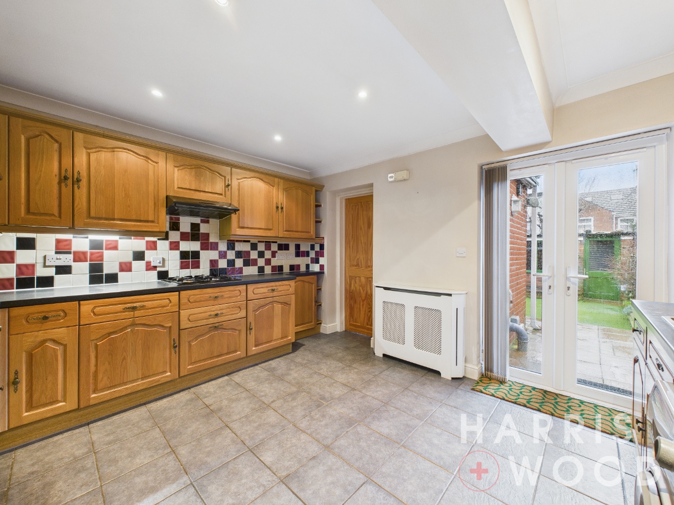 French doors, wall and base level units, sink and drainer with mixer tap over, oven and hob, extractor fan, worktop, space for appliances, door to: