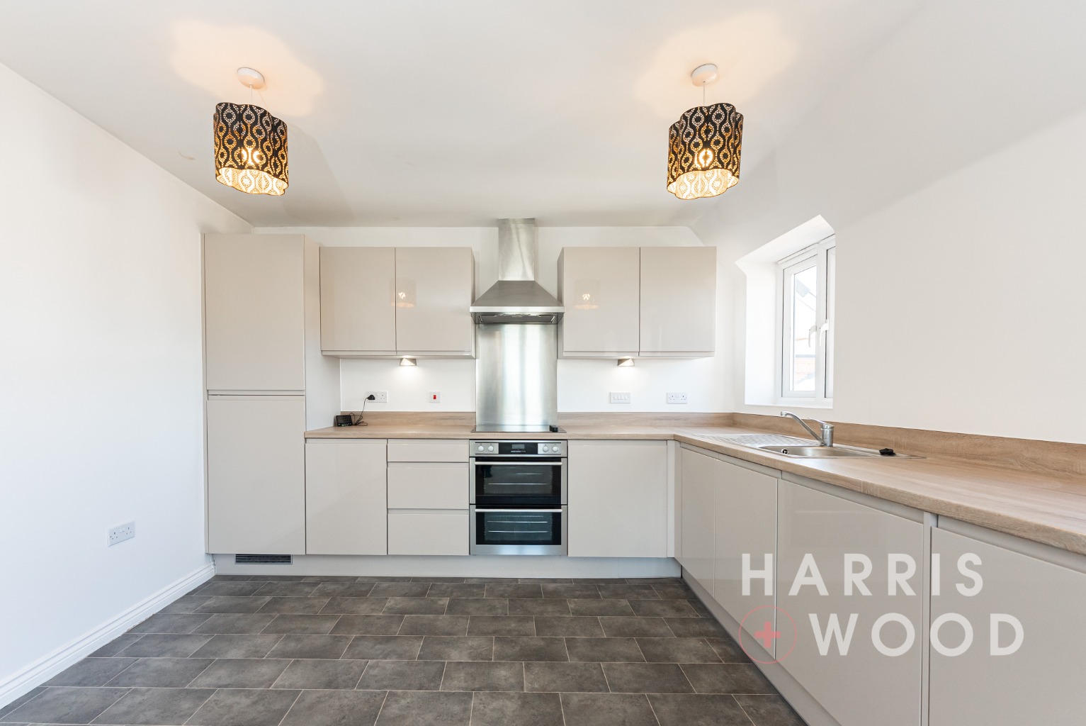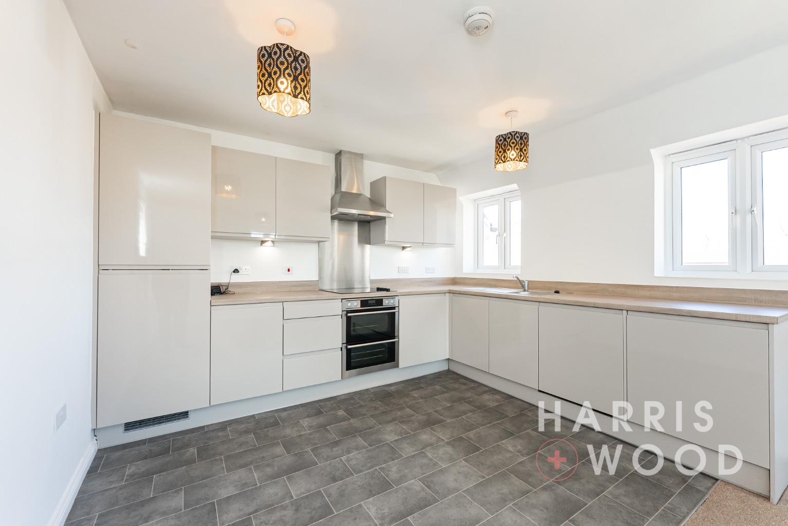 Two double glazed windows to side, wall and base level units, integrated fridge/freezer, oven, hob, extractor fan, dishwasher, washer/dryer, worktops, vinyl flooring