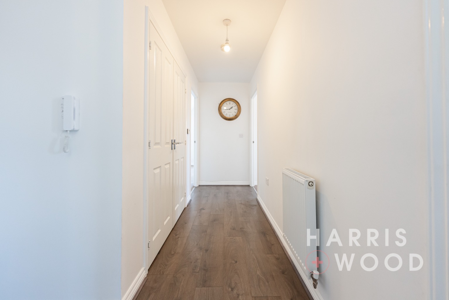 Entrance door, radiator, laminate flooring, storage cupboard, doors leading off