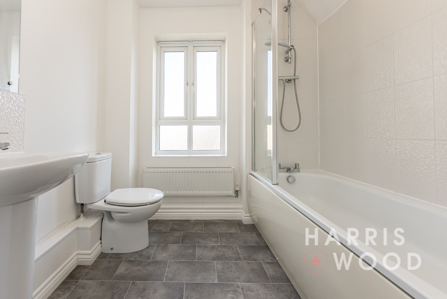Obscured double glazed window to rear, low level WC, pedestal hand wash basin, panelled bath with shower over, radiator, vinyl flooring