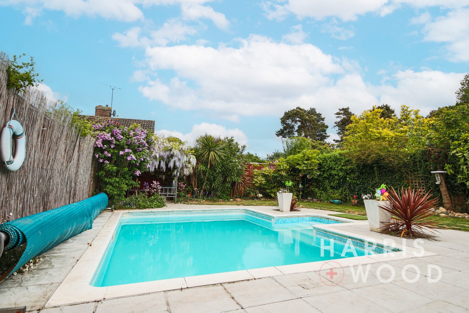 Fully enclosed and private, laid to lawn, flower beds, trees and shrubs, swimming pool, patio area