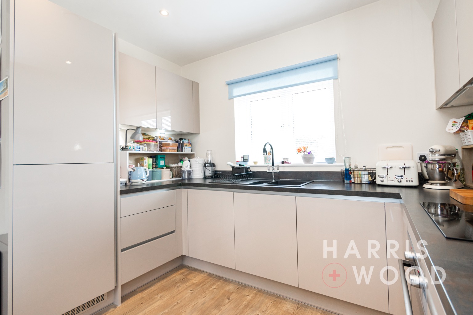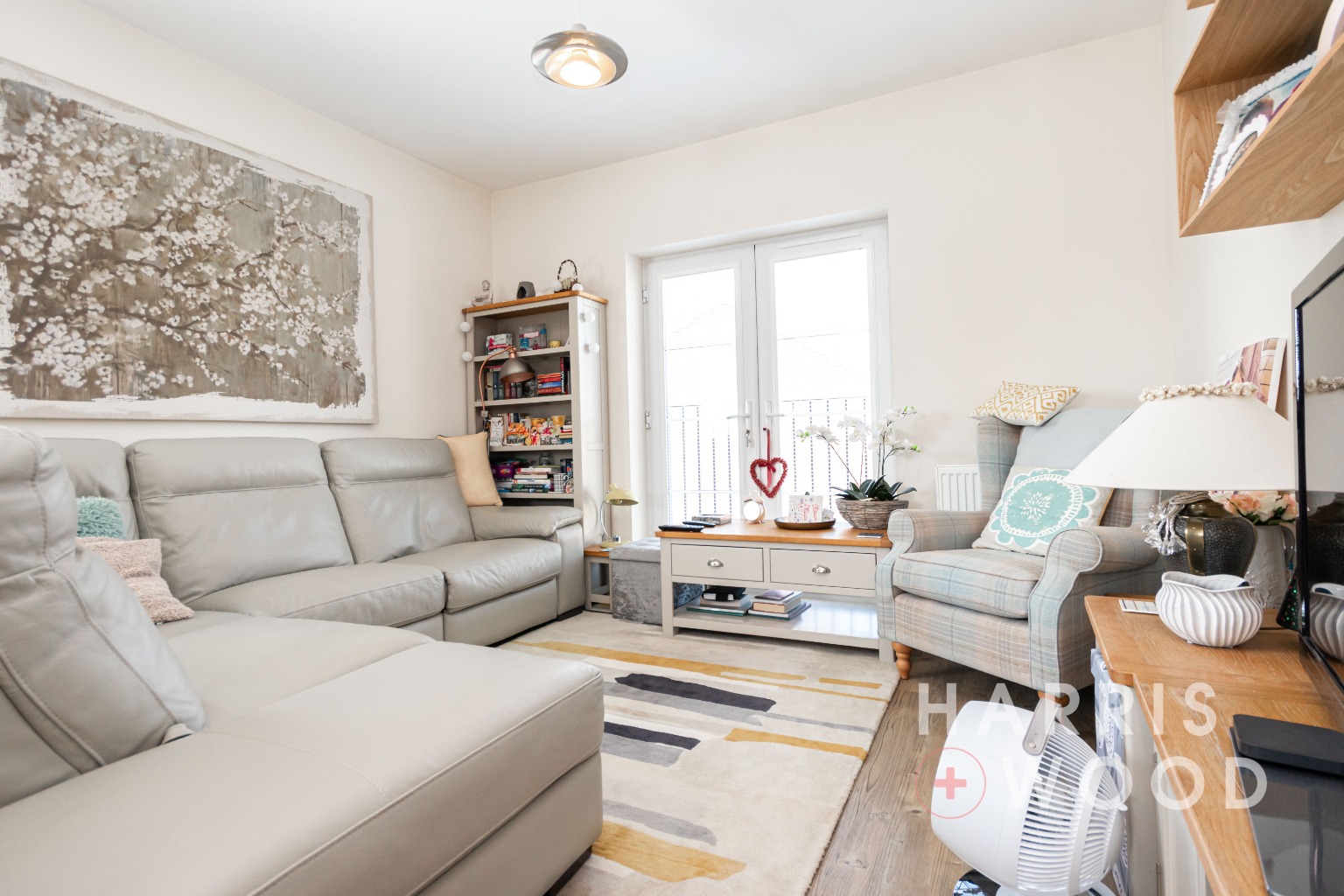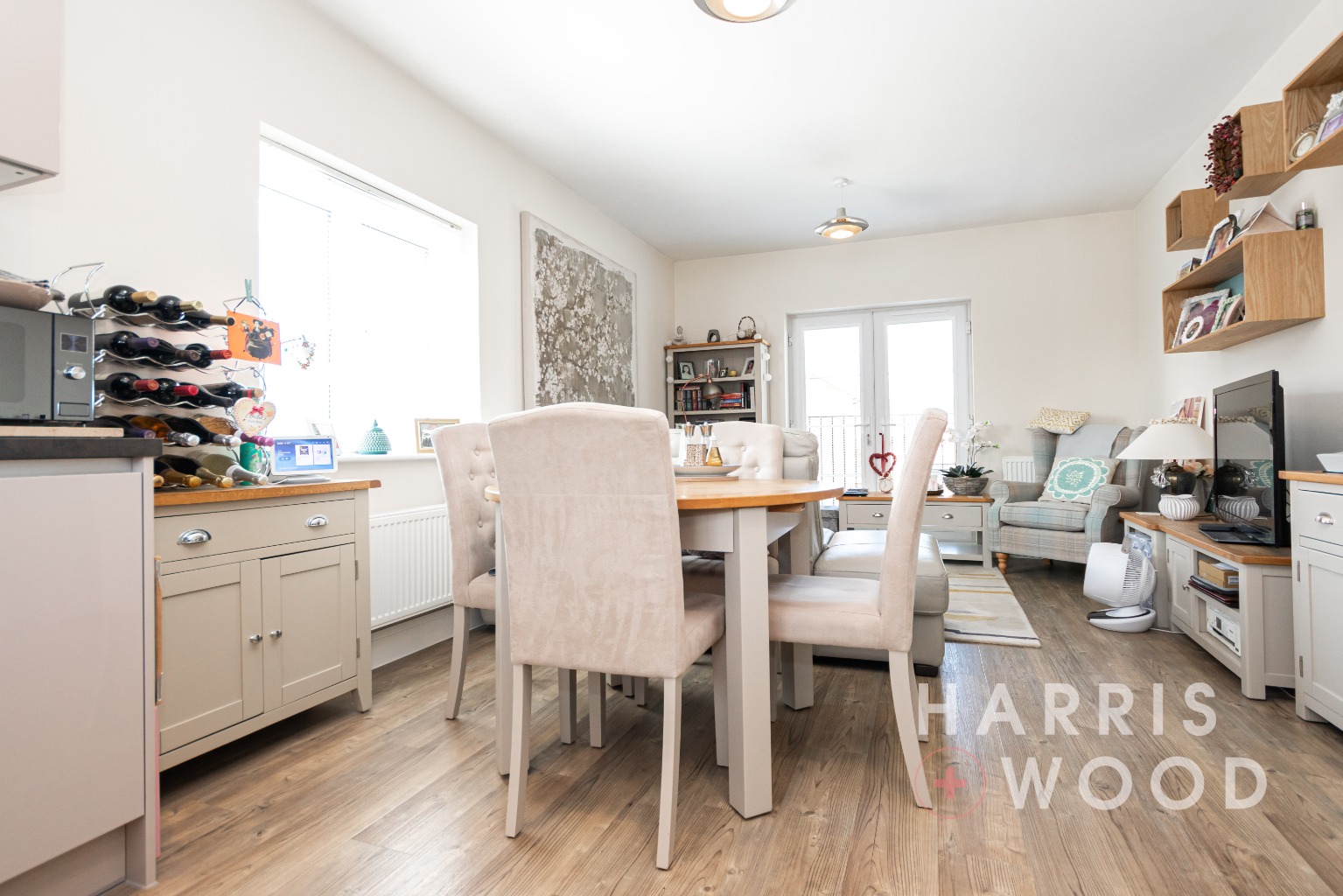 At the heart of the home is an open-plan lounge/diner which seamlessly incorporates a well-equipped kitchen complete with integrated appliances. The bright and airy lounge area features French doors opening onto a Juliet balcony, bringing in plenty of natural light and offering a lovely elevated outlook.