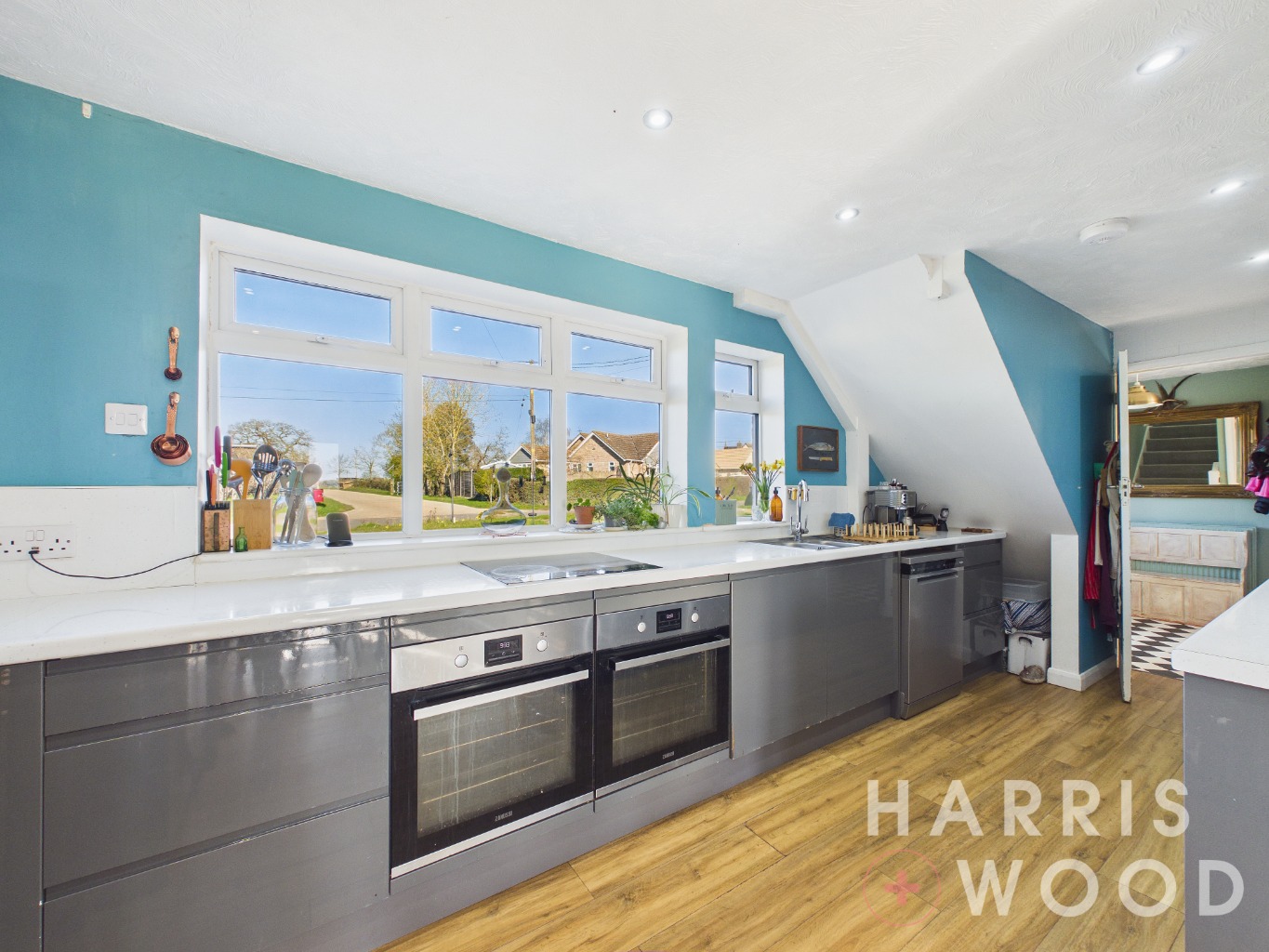 Double glazed window, wall and base level units, sink and drainer with mixer tap over, two ovens and hob, worktops, space for appliances