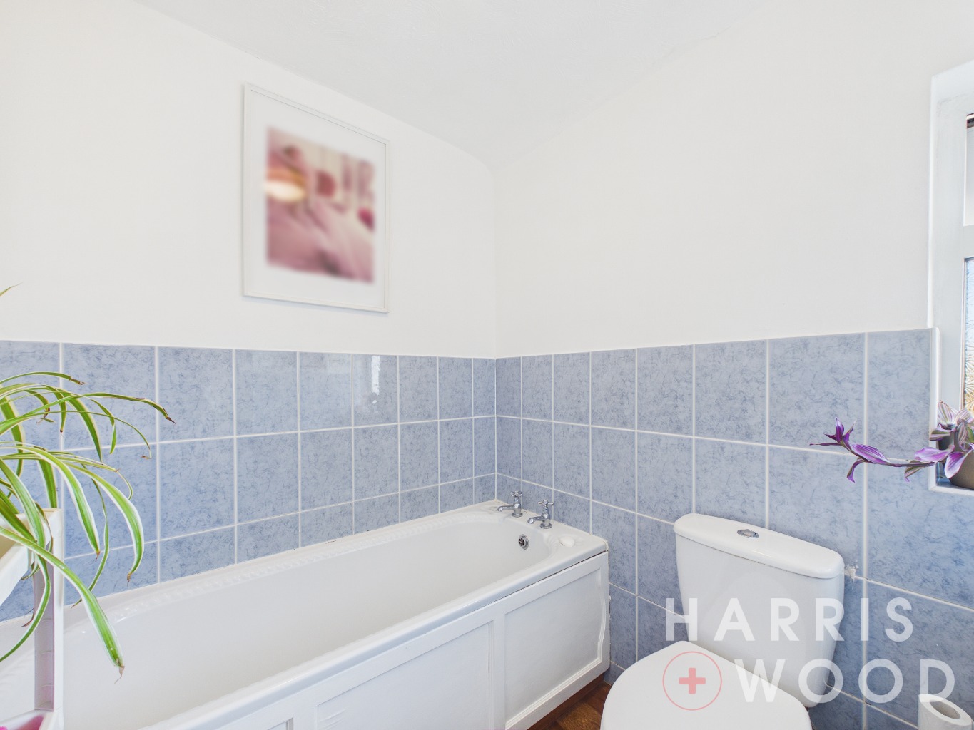 Double glazed window, low level WC, wash hand basin, bath, partly tiled walls, radiator