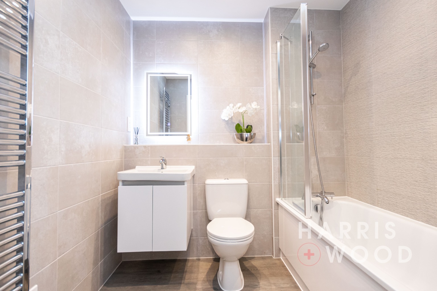 Bath with shower over, low level W.C, wash hand basin with two tier storage, heated towel rail, and fully tiled walls