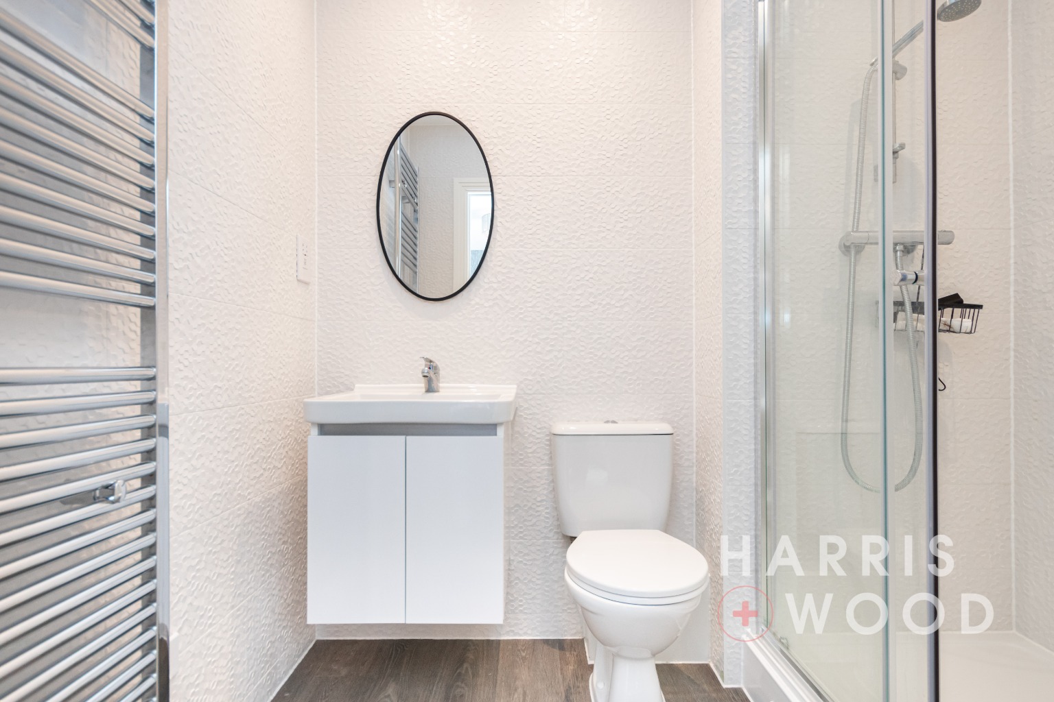 Fitted shower with shower attachment over, fully tiled walls, heated towel rail, wash hand basin, low level W/C