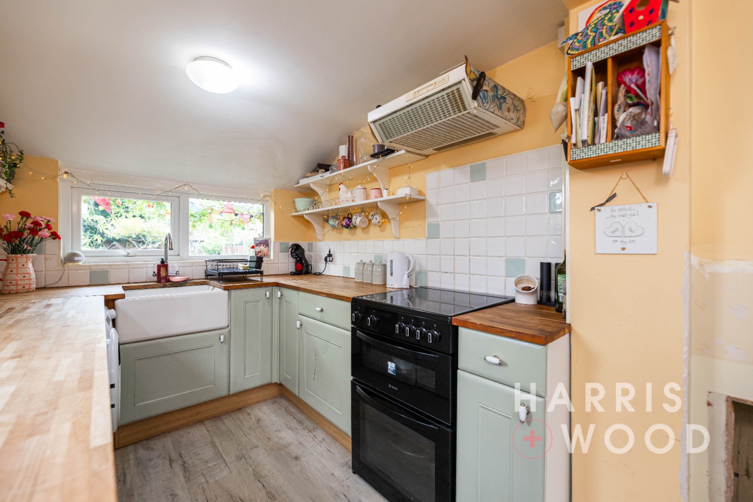 Double glazed window to side, single glazed window to side, wall and base level units, butler sink and drainer with mixer tap over, oven and hob, extractor fan, worktops, integrated fridge/freezer, space for appliances