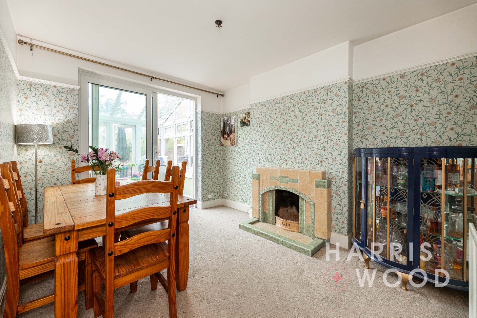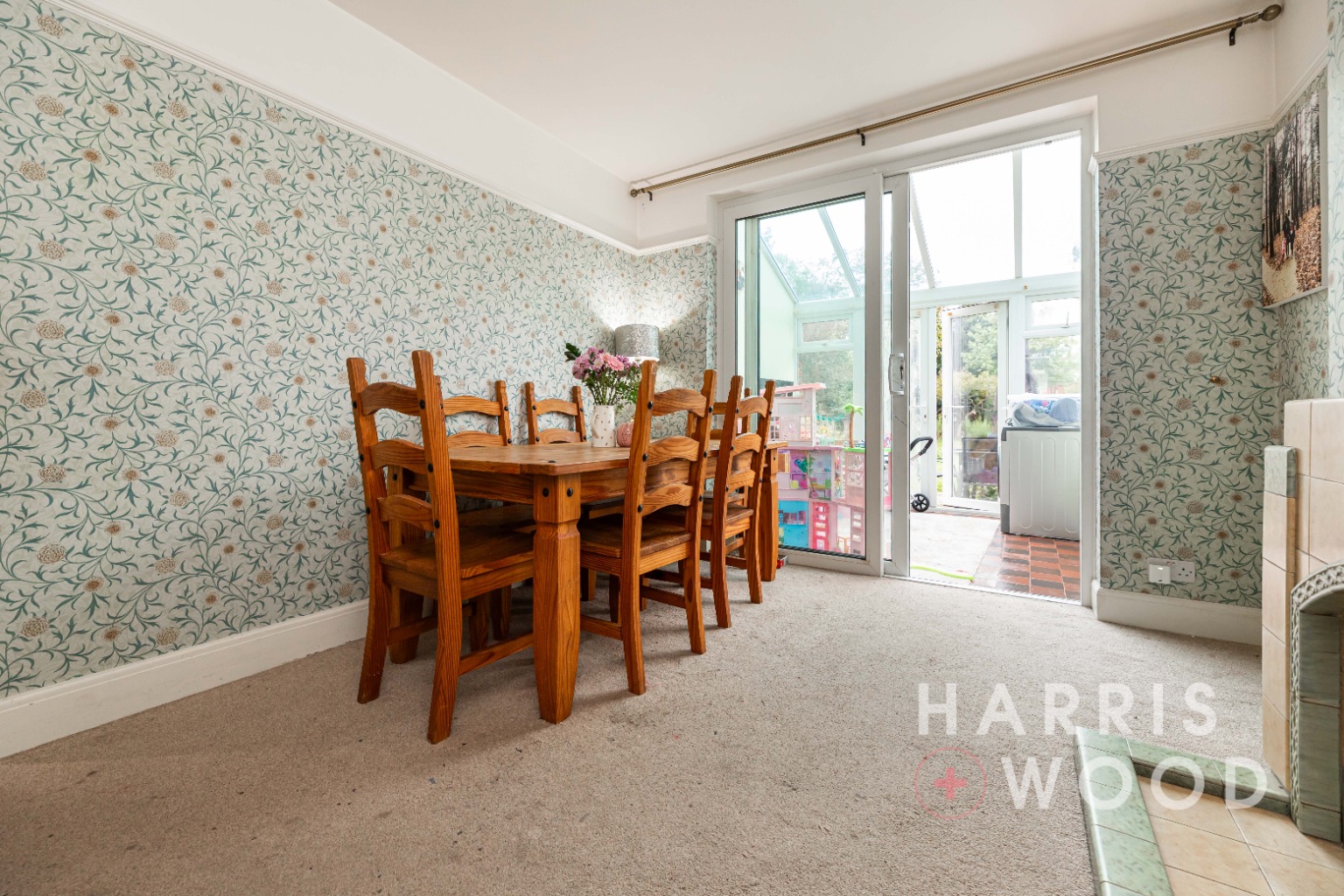 Doors leading into the conservatory, fireplace, radiator