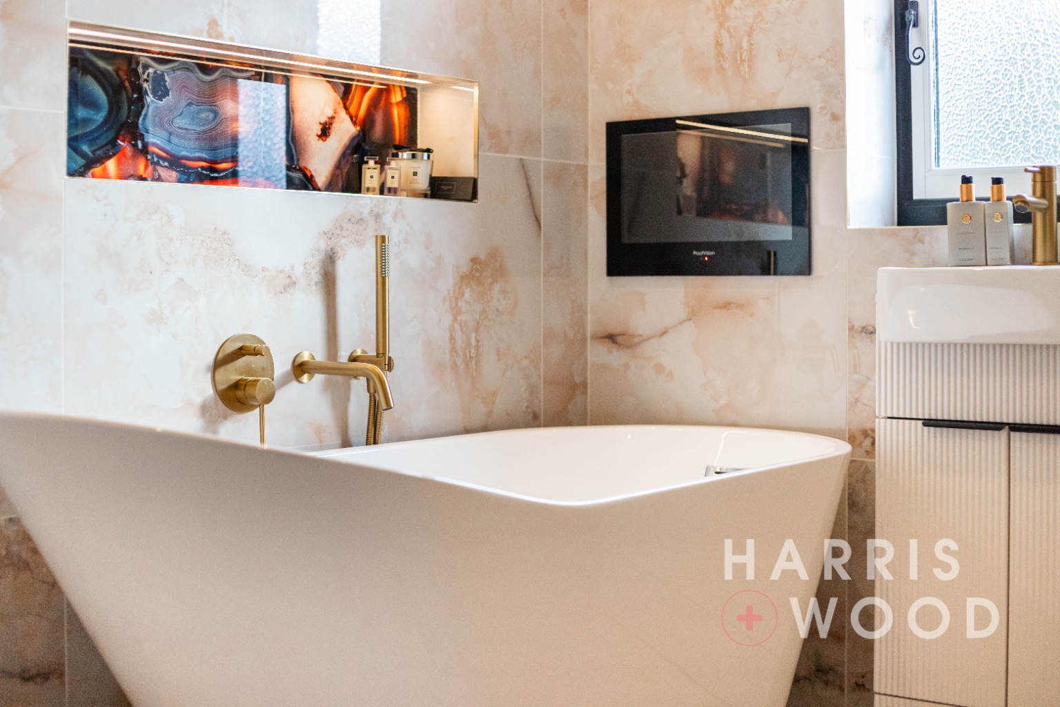Low level WC, wash hand basin, free standing bath with TV, walk in shower, electric underfloor heating, fully tiled