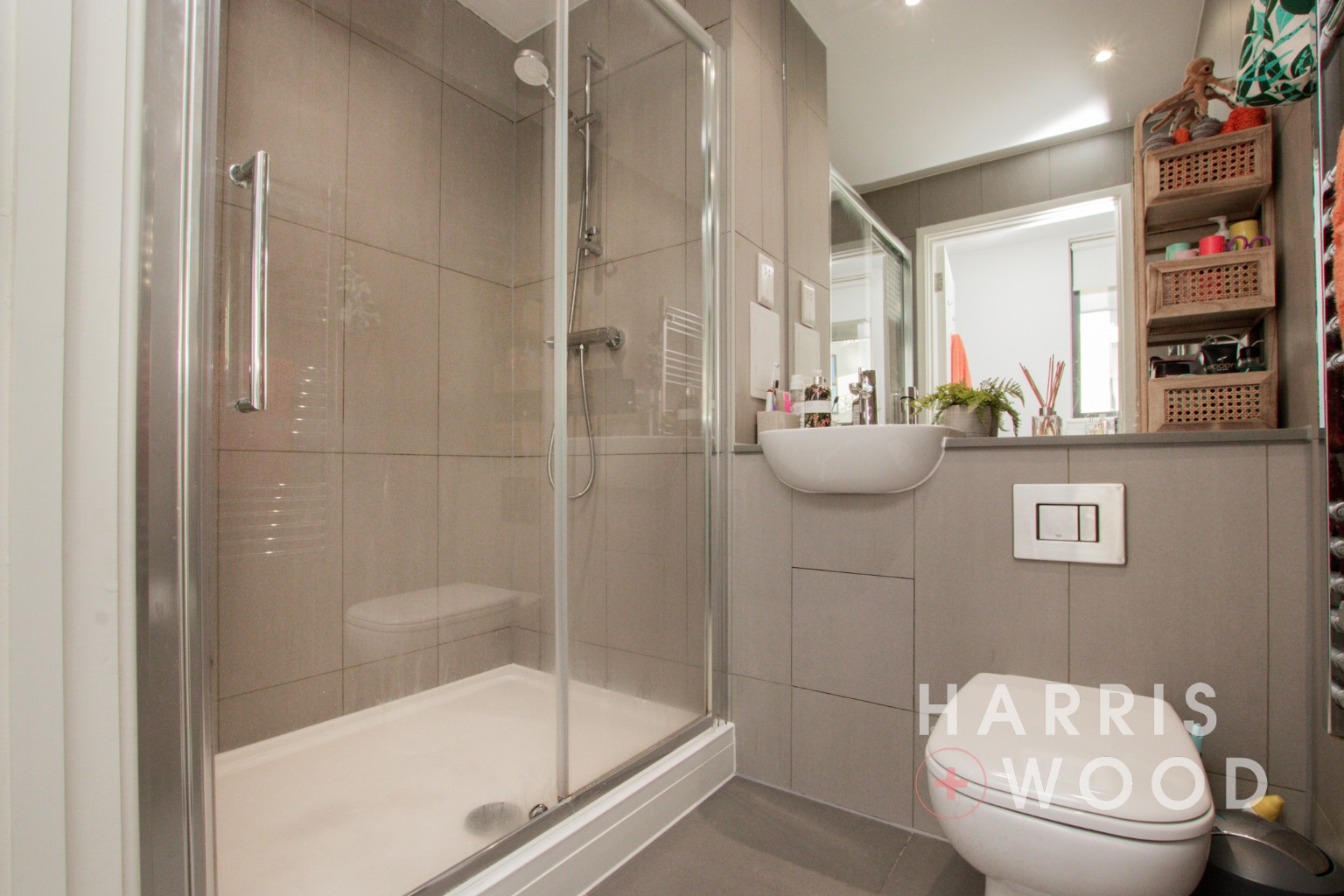 Low level WC, vanity wash hand basin, shower cubicle, partly tiled walls, tiled flooring