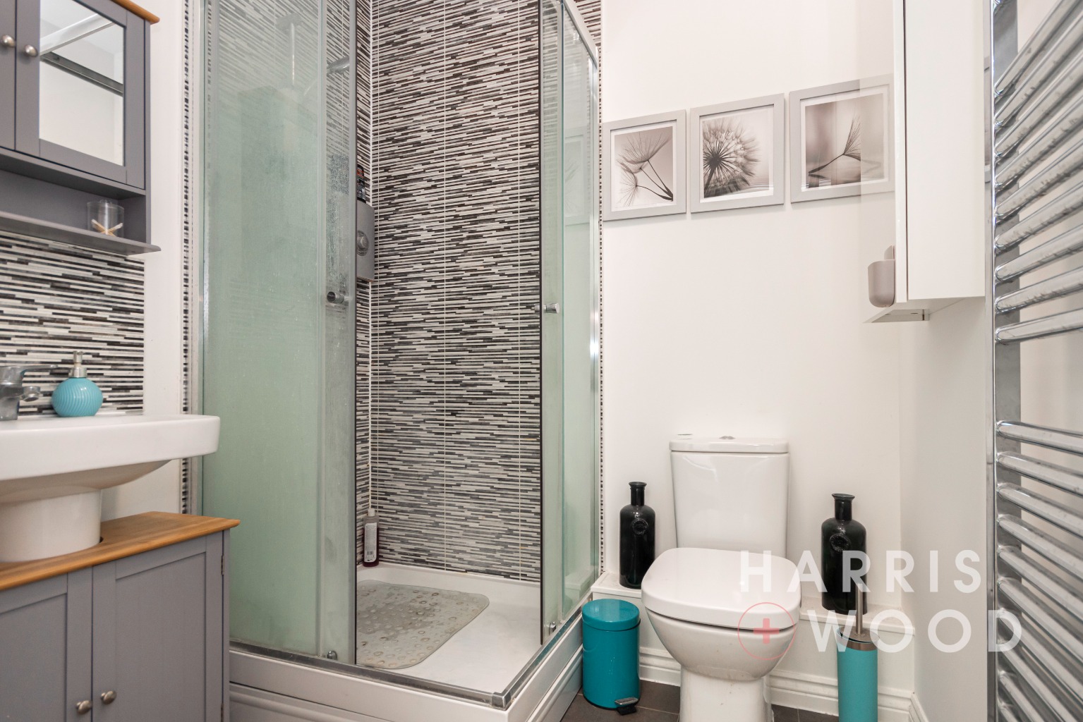 Double glazed window, low level WC, wash hand basin, shower cubicle, heated towel rail