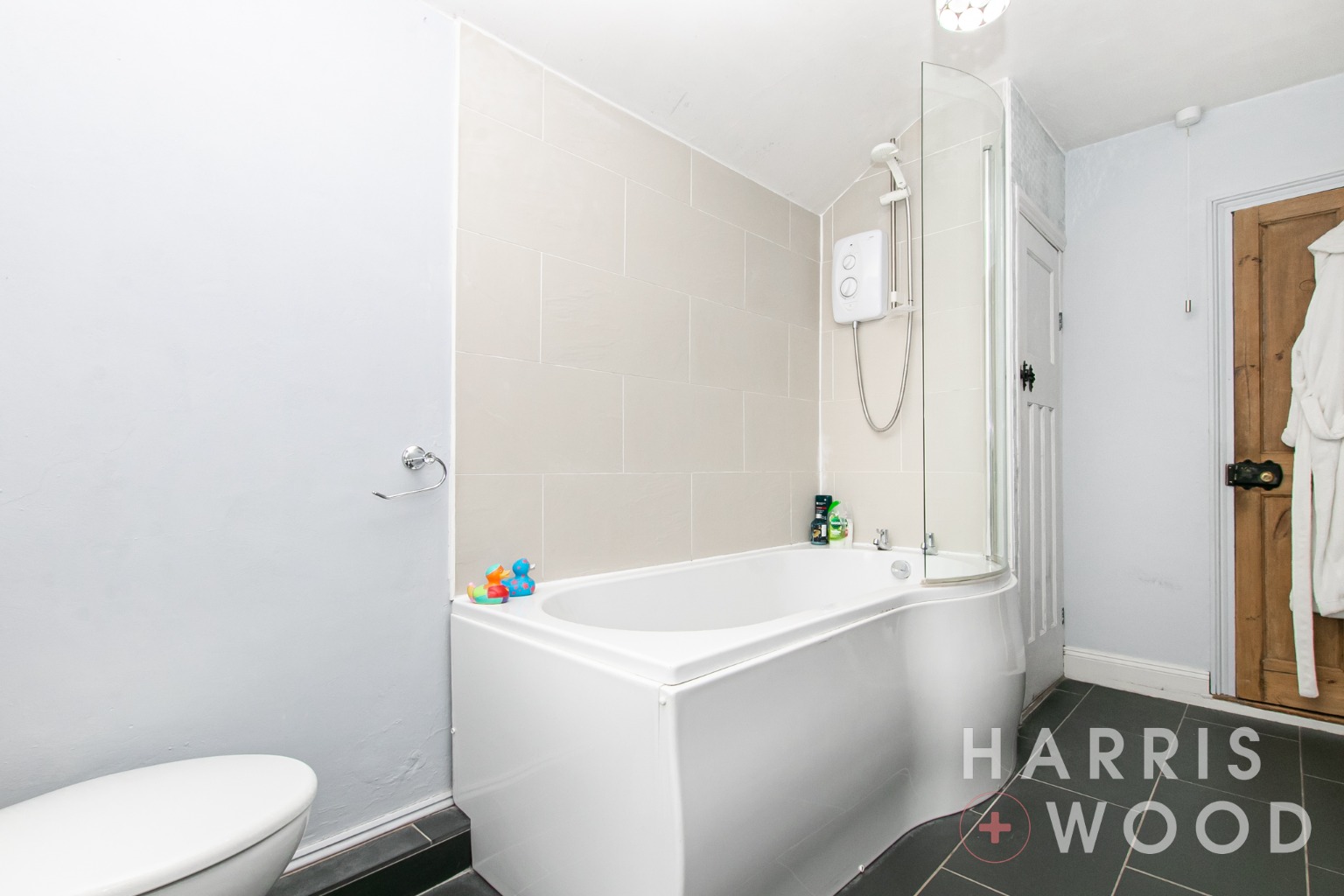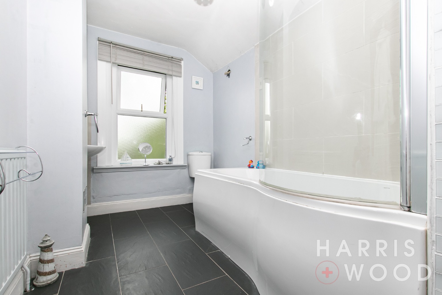 Double glazed window to rear, low level WC, wash hand basin, panelled bath with shower over, airing cupboard, radiator, part tiled walls, tiled flooring