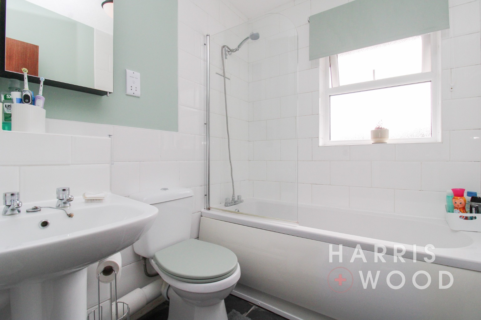Double glazed window to front, low level WC, pedestal wash hand basin, panelled enclosed bath with shower over, wall mounted electric heater