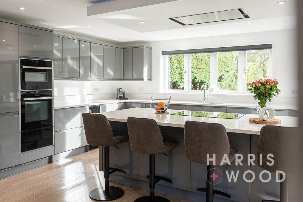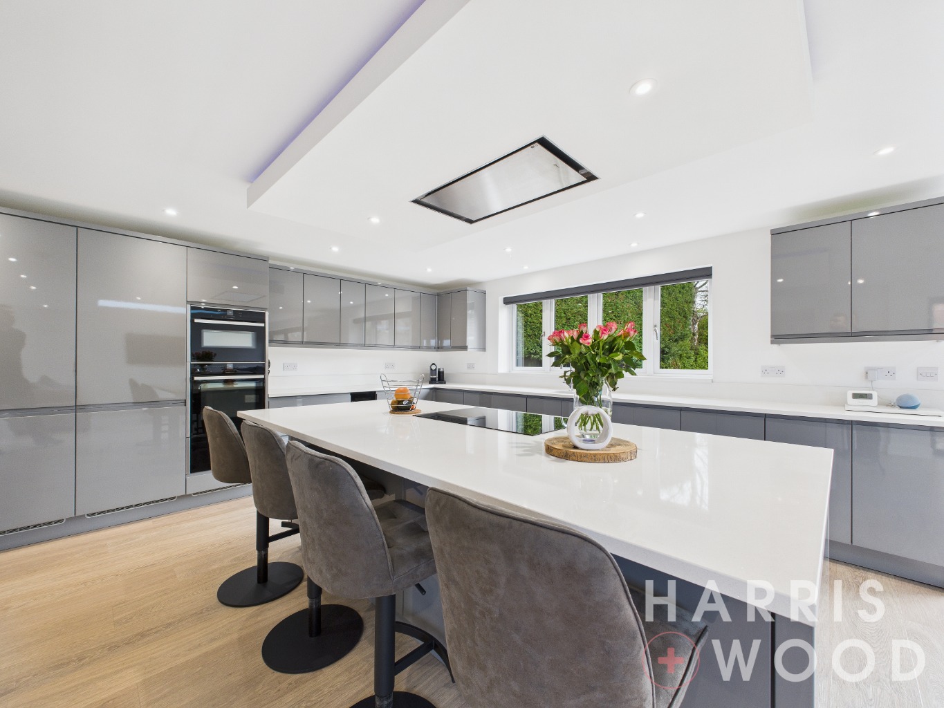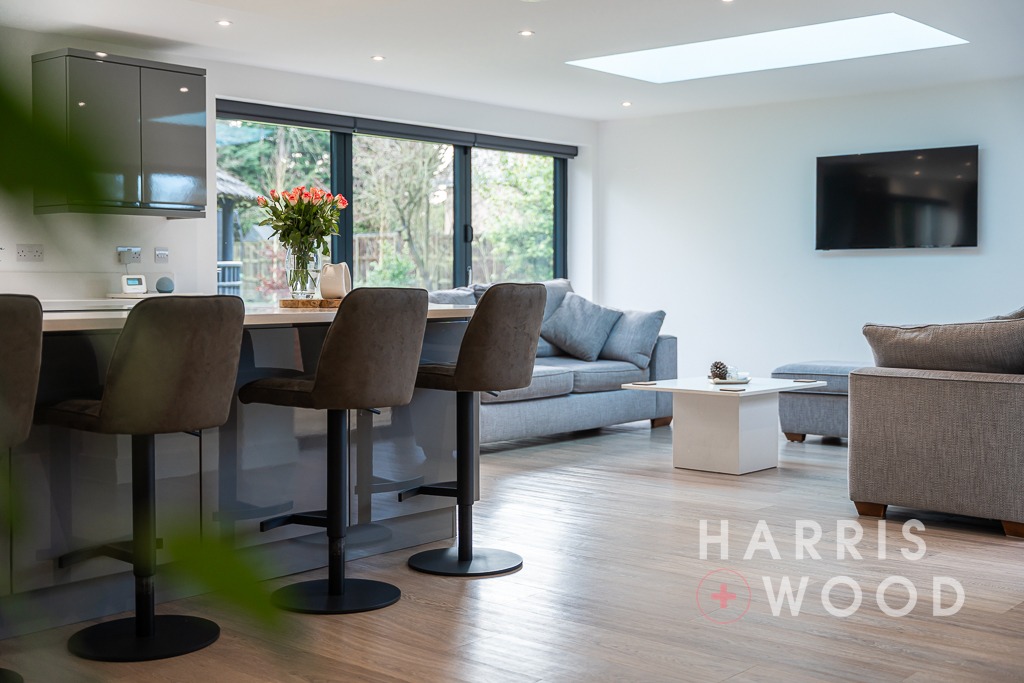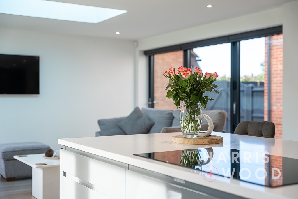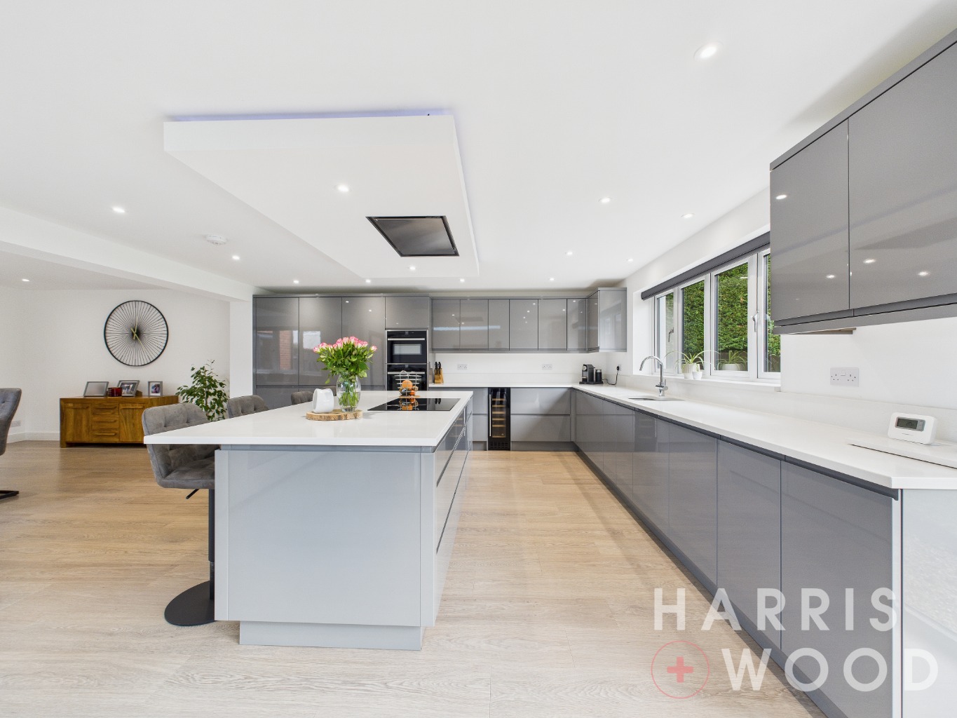 A standout open-plan space with two sets of bi-folding doors to the front and rear, skylight, spot lighting, fitted with a range of wall and base units with Quartz work surfaces, inset hob with extractor over, and inset sink with mixer tap, integrated appliances include fridge, freezer, ovens, drinks fridge, and dishwasher