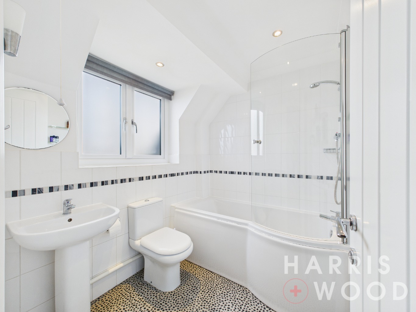 UPVC window to the front, panelled bath with shower and shower screen over, close coupled WC, pedestal wash hand basin with mixer tap, radiator